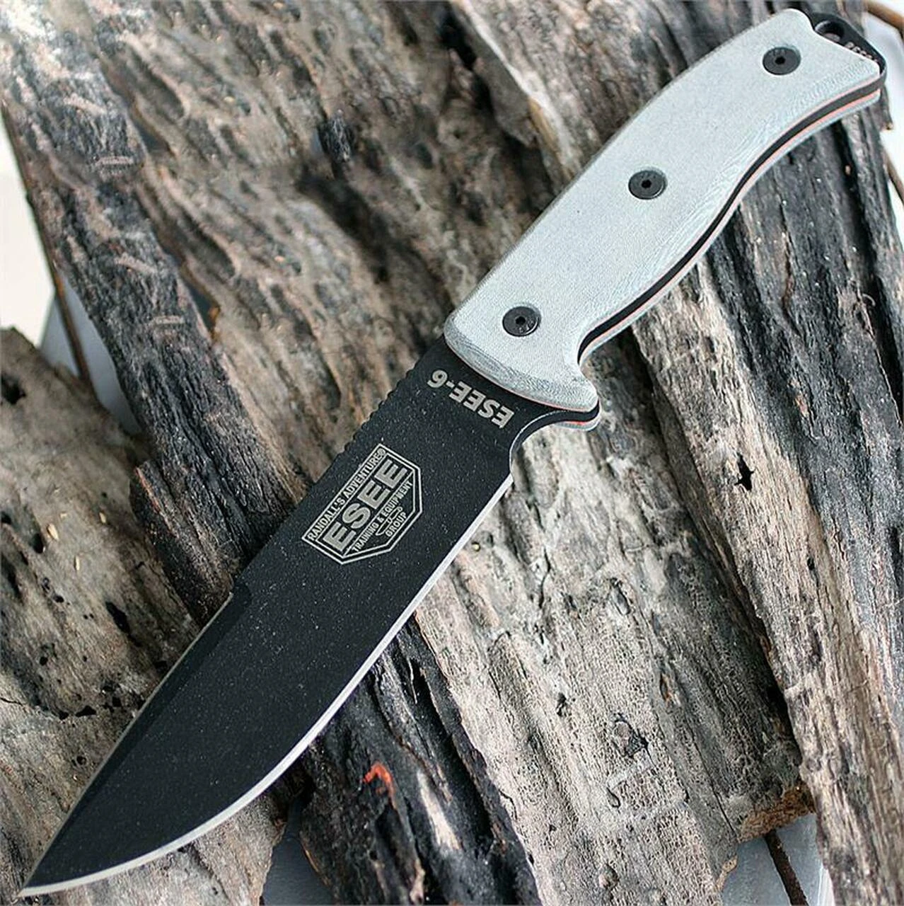 The ESEE-6P-CP fixed blade knife features grey linen Micarta scales and a black finished blade with a plain cutting edge and sharpened upper edge. Includes an OD Green molded sheath, clip plate, paracord and cord lock