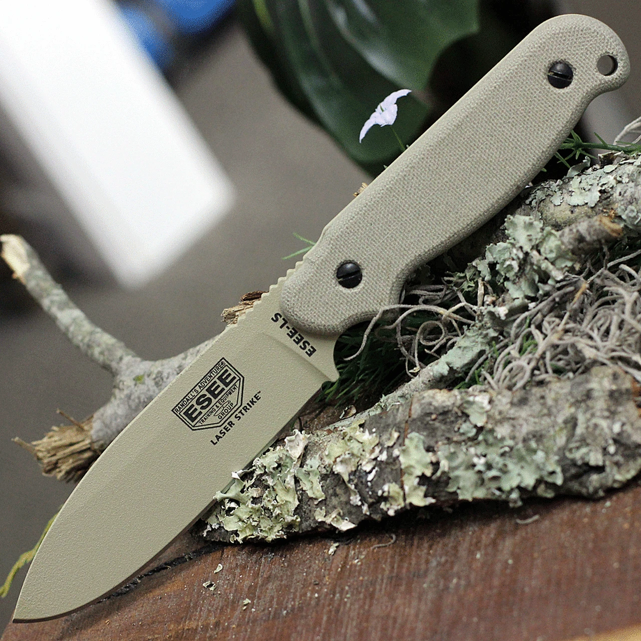 ESEE Laser Strike Knife, Desert Tan Plain Edge, Black Kydex Sheath, Fire Steel and Tinder Tabs Included In Handle