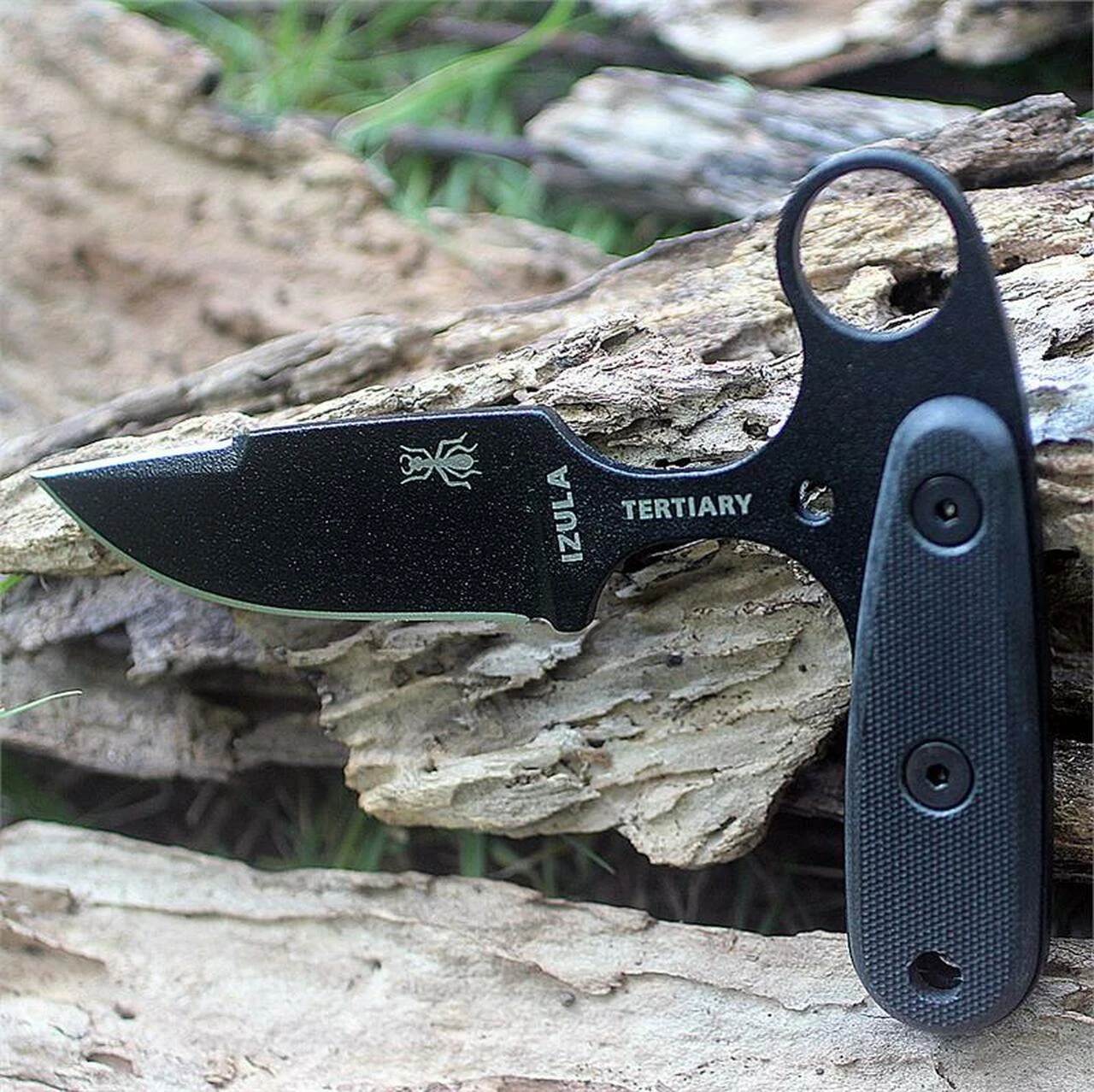 The Tertiary was developed by SWAT officer Lee Smith as a Law Enforcement / Military defense tool. Born from the legendary Izula line, the Tertiary name (meaning third in order or level) comes from an edged weapons natural place in the panoply of personal weapons (primary firearm, backup firearm and then close-quarters weapons). Its design characteristics target specific professional needs such as swift, effective deployment, reliable cutting and penetration, low visibility profile, modular carry options, and robust construction. Simple straight punch, jab, and hammer fist strikes yield tremendous cutting potential with minimal training or effort. The sheath works well in the waist area from the 10 to 2 oclock positions. Clipped in a vertical position under a duty belt or inside the pants gives more than enough retention for a clean draw stroke and safe re-sheathing. The clip plate can be removed to expose the accessory holes to facilitate paracording to MOLLE webbing, or worn as a neck sheath.