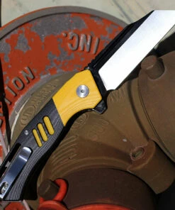 Bestech Platypus BG28B Flipper Knife, 3.43″ D2 Two-Tone Sheepsfoot Blade, Milled Orange G-10 Handle