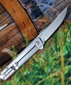 Boker Plus Kwaiken Damascus Flipper 01BO297, 3.5″ Damasteel Gray Plain Blade, Gray Titanium Handle