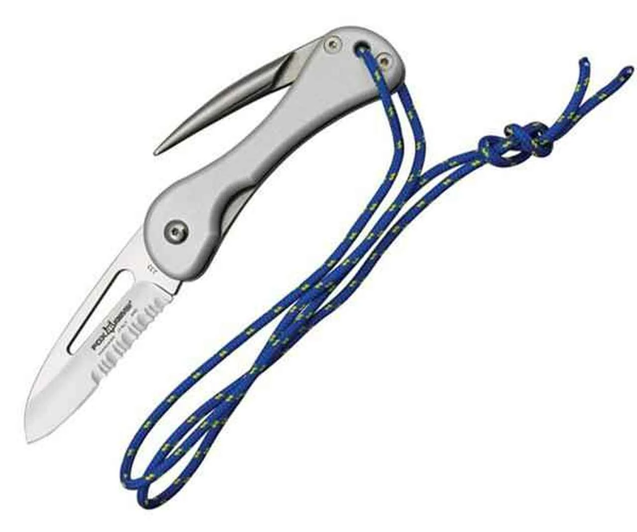 Fox Sailing Knife. 4 1/8″ closed linerlock. 2 7/8″ partially serrated 440C stainless blade with shackle slot and marlin spike. Hardened to HRC 57-59. Silver anodized T6-6061 aluminum handles. Lanyard hole with blue and yellow lanyard. Lanyard colors may vary.