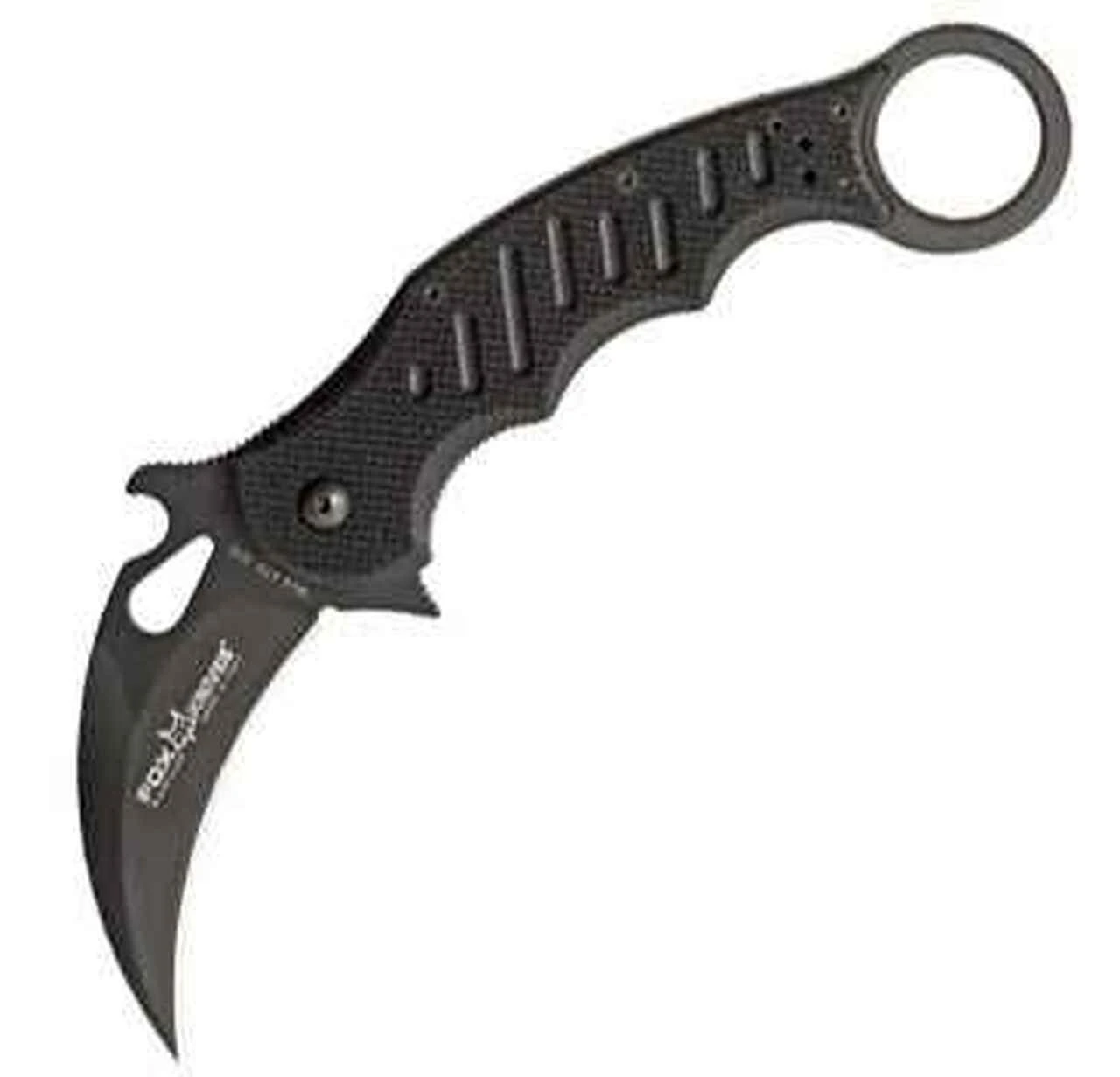 Fox USA Karambit. 5 1/4″ closed linerlock. 3″ black Teflon coated N690Co vanadium stainless blade with thumb slot and extended tang. Black G-10 handles with black finish stainless pocket clip. Integrated finger hole.