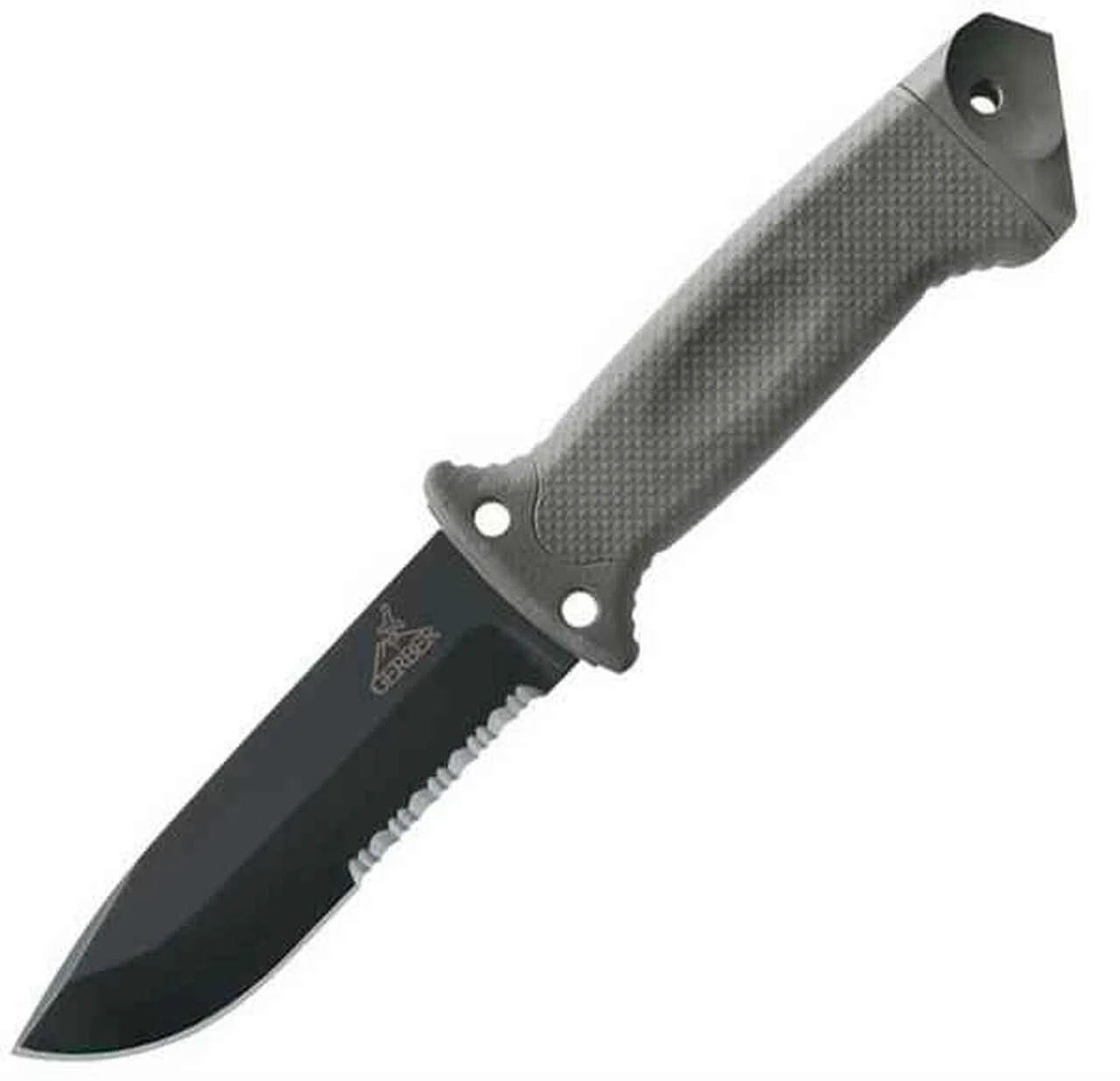 Gerber LMF II Infantry Green Partially Serrated.10 3/4 in. overall.4 7/8 in. partially serrated 420HC stainless blade with a non-reflective finish.Foliage green TPV overmolded on nylon handle.Full tang with butt cap that cab be used as a hammer.Knife comes with a sheath that is MOLLE vest attachable.