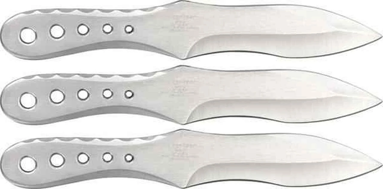 Gil Hibben Gen-X Throwing Set. Three piece set. Knives are one piece AUS-6 stainless construction. 7″ overall. 3 5/8″ blade. Handles have machined hole cutouts. Black nylon belt sheath. Includes paper target.