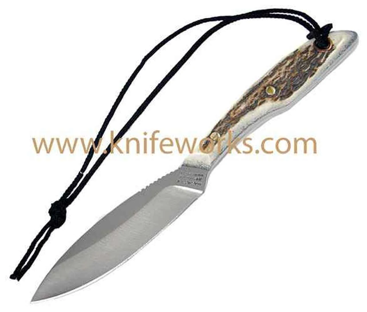 Grohmann Original Design. 8 1/2″ overall. 4″ stainless elliptical blade. Genuine stag handles. Full tang. Lanyard. Brown leather belt sheath. Designed by D. H. Russell.