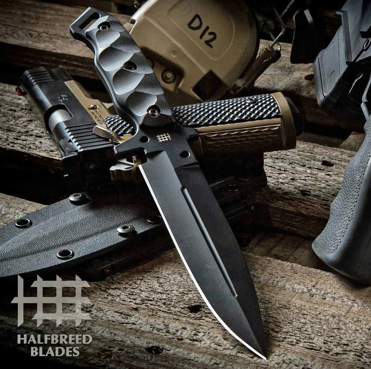 Halfbreed Blades Medium Infantry Knife (MIK-01P BLK) – 6.49″ D2 Black Teflon Coated Plain Edge Spear Point Blade, Blake G-10 Handle – Black Molded Kydex Sheath