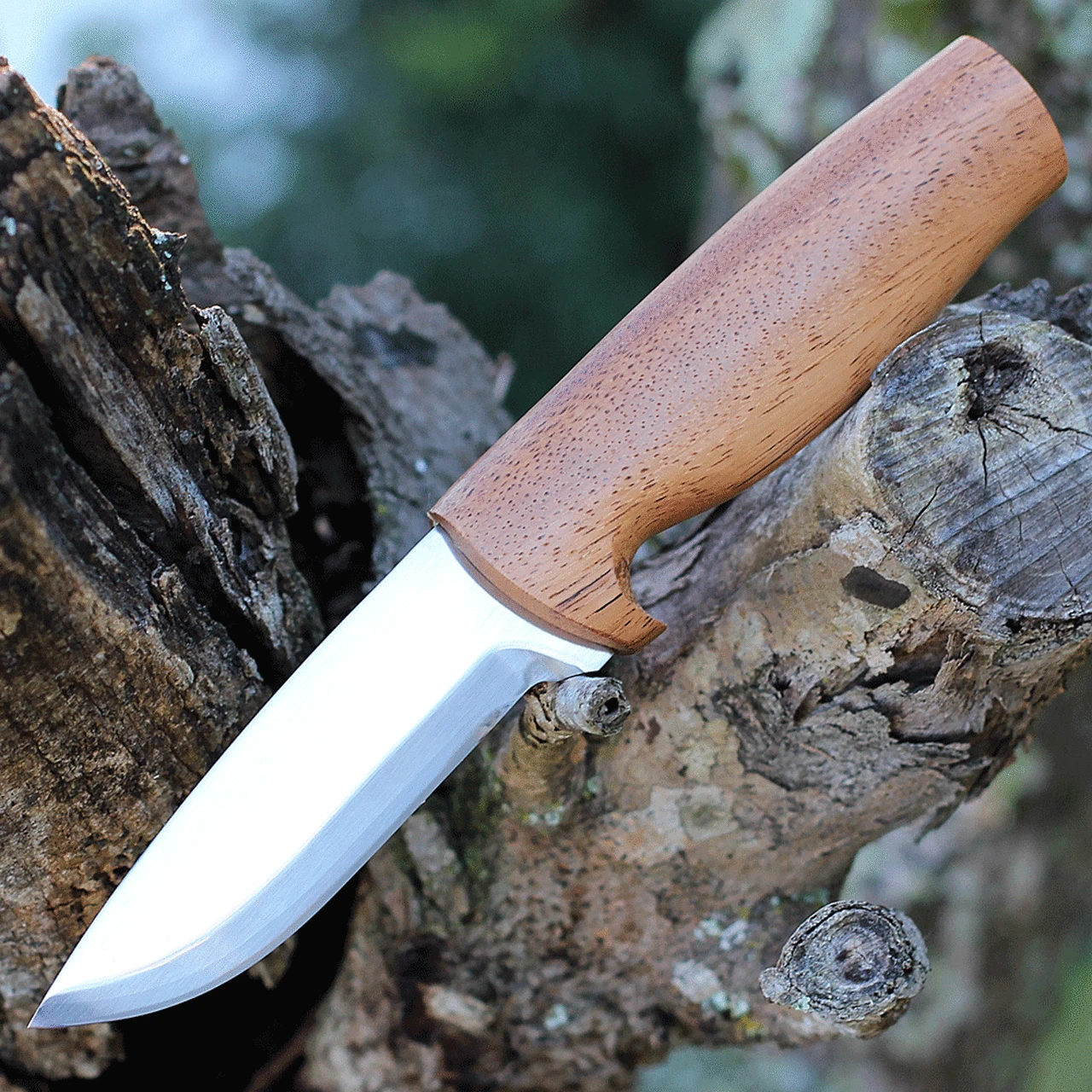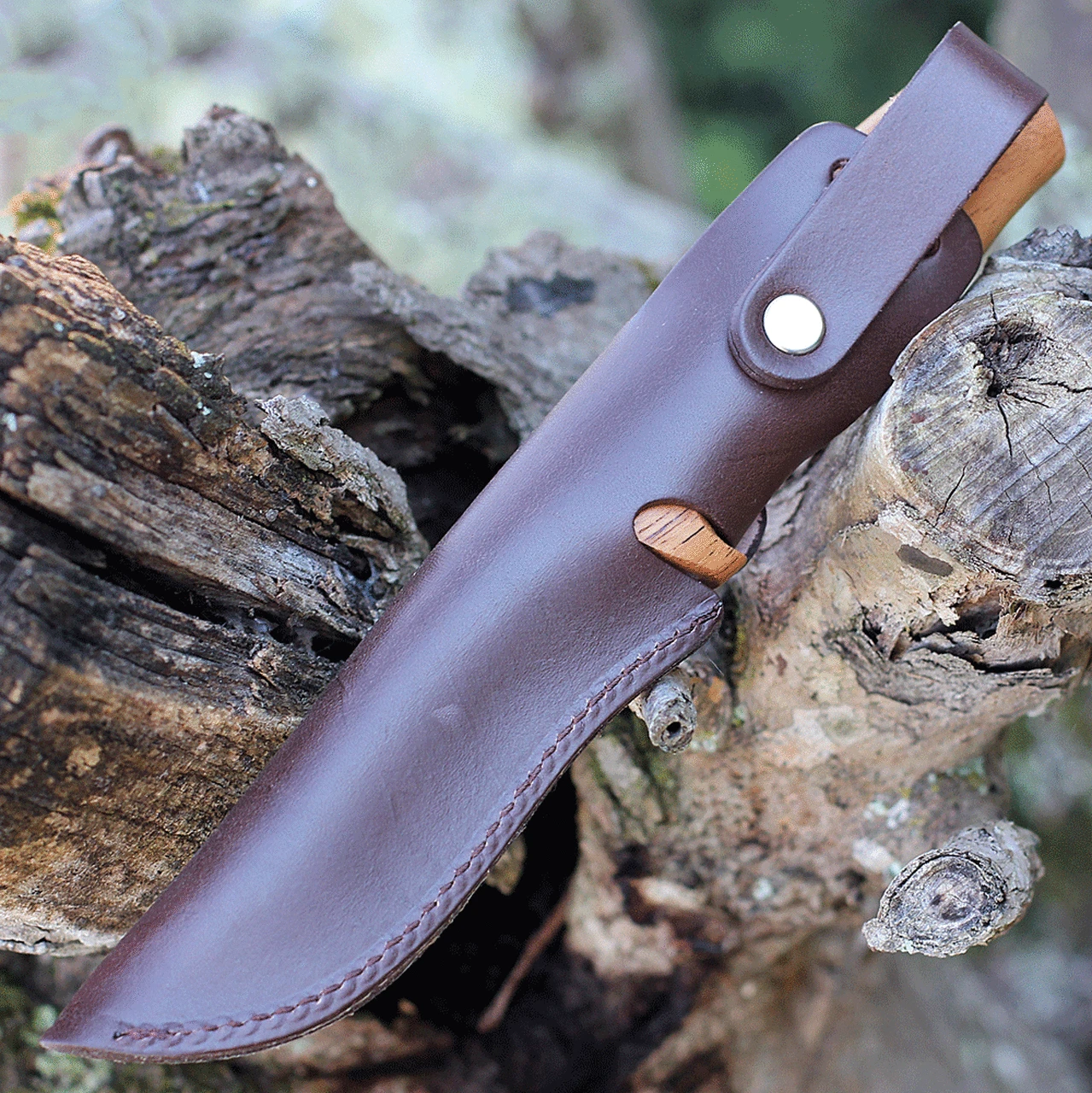 The walnut handle is shaped to give a secure finger guard to keep your hand off the blade. The knife comes in a brown leather sheath with a snap style keeper strap.