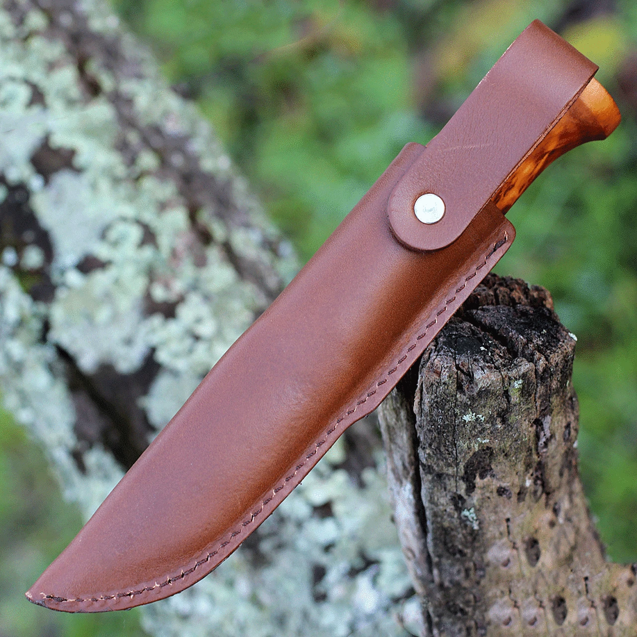 This highly polished laminated stainless steel blade is shaped for every day chores. The comfortable grip is shaped to keep your hands off the blade. It comes with the traditional pouch style sheath that does not require a keeper strap.