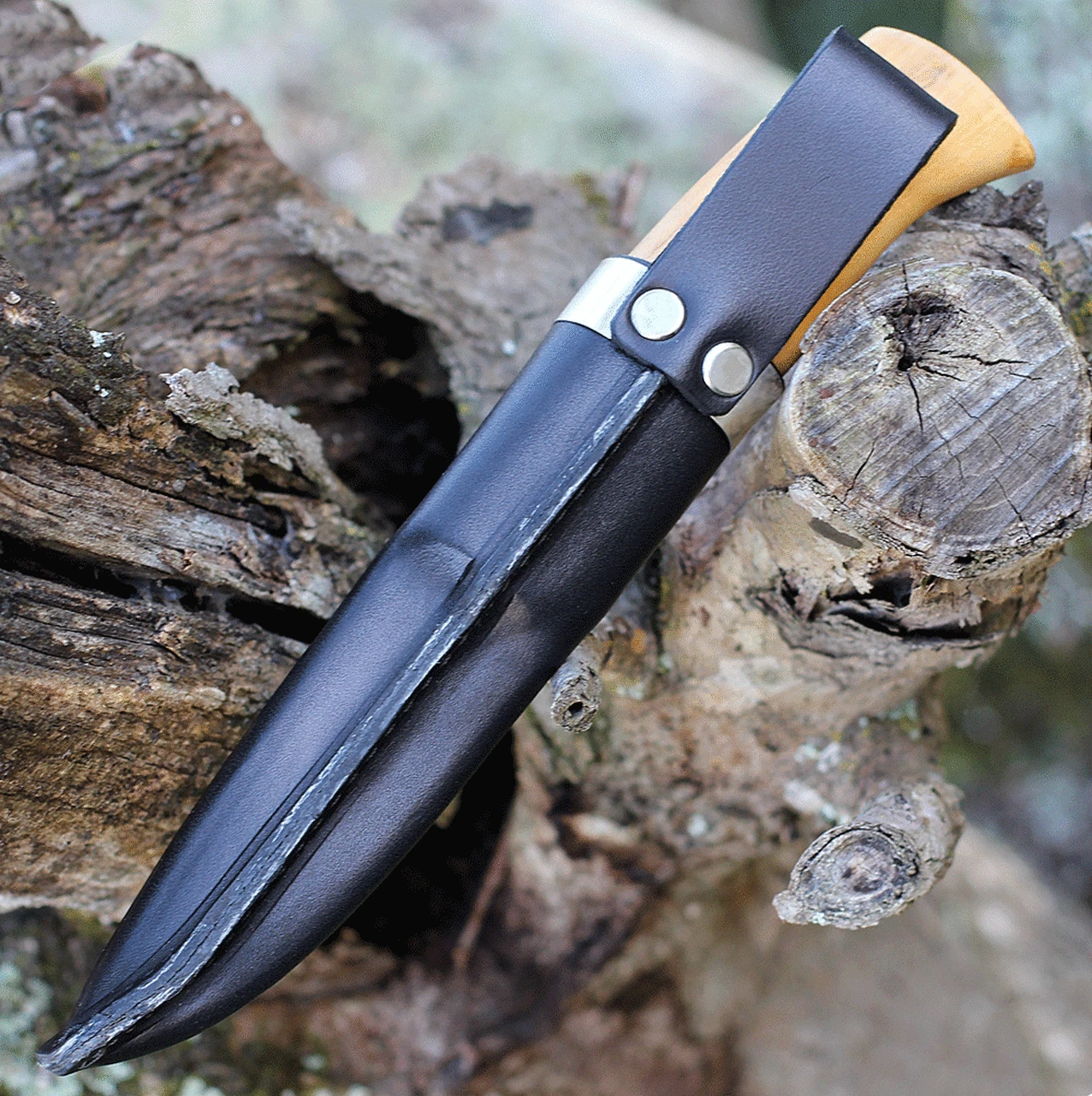 The blade is made of triple laminated stainless steel with a handle of curly birch and walnut with leather spacers. There is a small guard on the handle providing security. It comes with a pouch type sheath reinforced with a metal band without any need for snaps or straps to securely hold the knife.