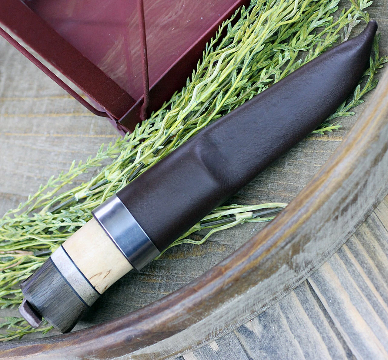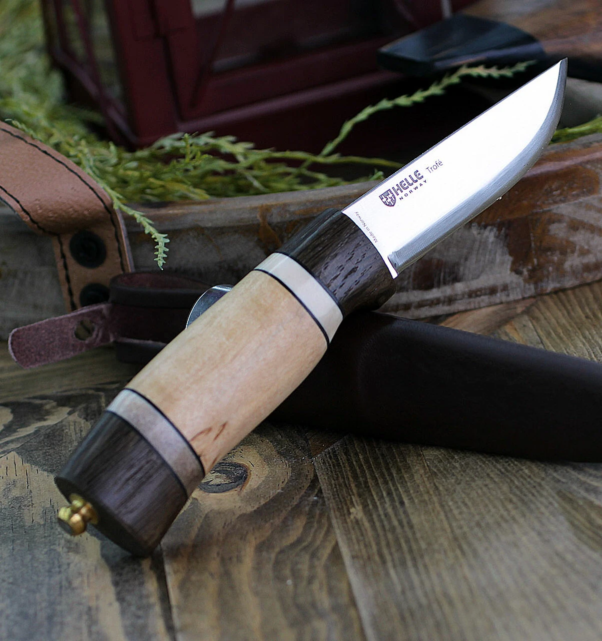 Helle Trofe 85, 3.5 ” Triple Laminated Stainless Steel Drop Point Blade, Darkened Oak, Leather, Staghorn and Curly Birch Handle