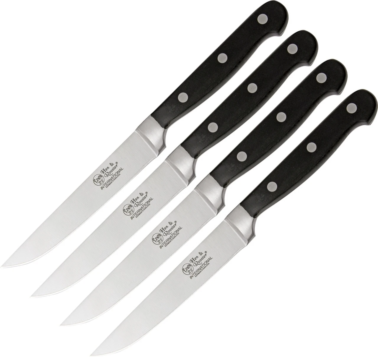Hen & Rooster HRI008 Four Piece Steak Knife Set, 4.75″ 440A Stainless Plain Blade, Stainless Guard, Black Bakelite Handle