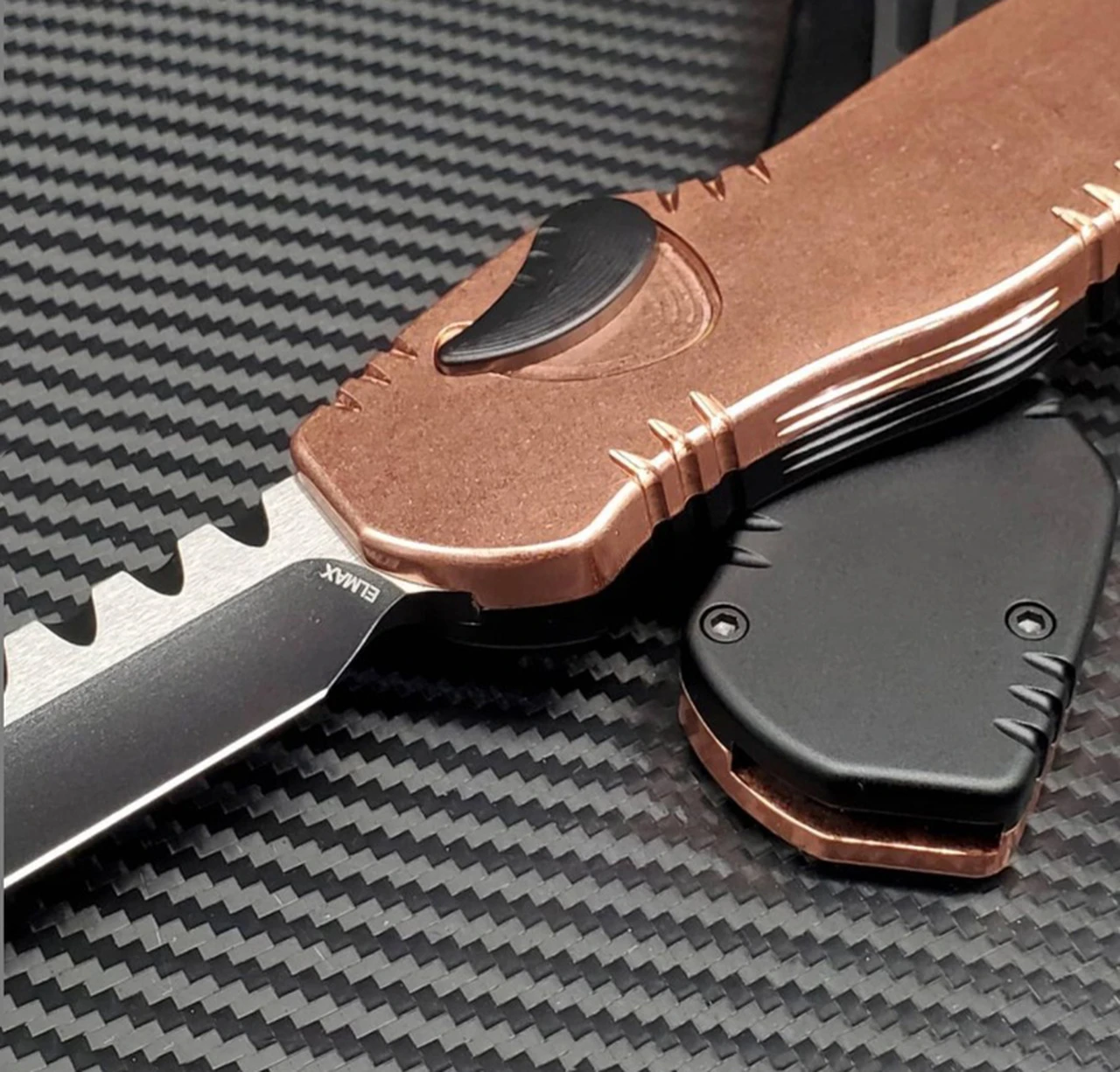 Heretic Knives Hydra V.2 OTF Automatic (H006-10A-COPPER) – 3.625″ Elmax Two-Tone Tanto Blade, Copper Front with Black Aluminum Back, Black Hardware