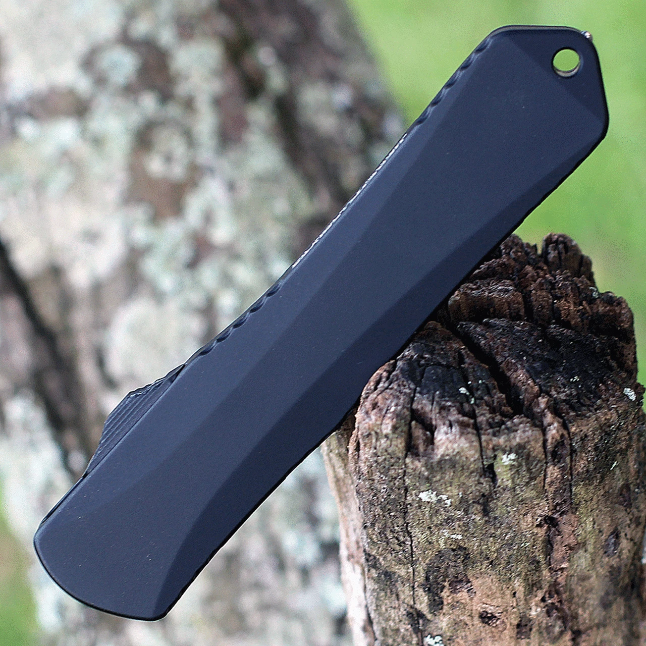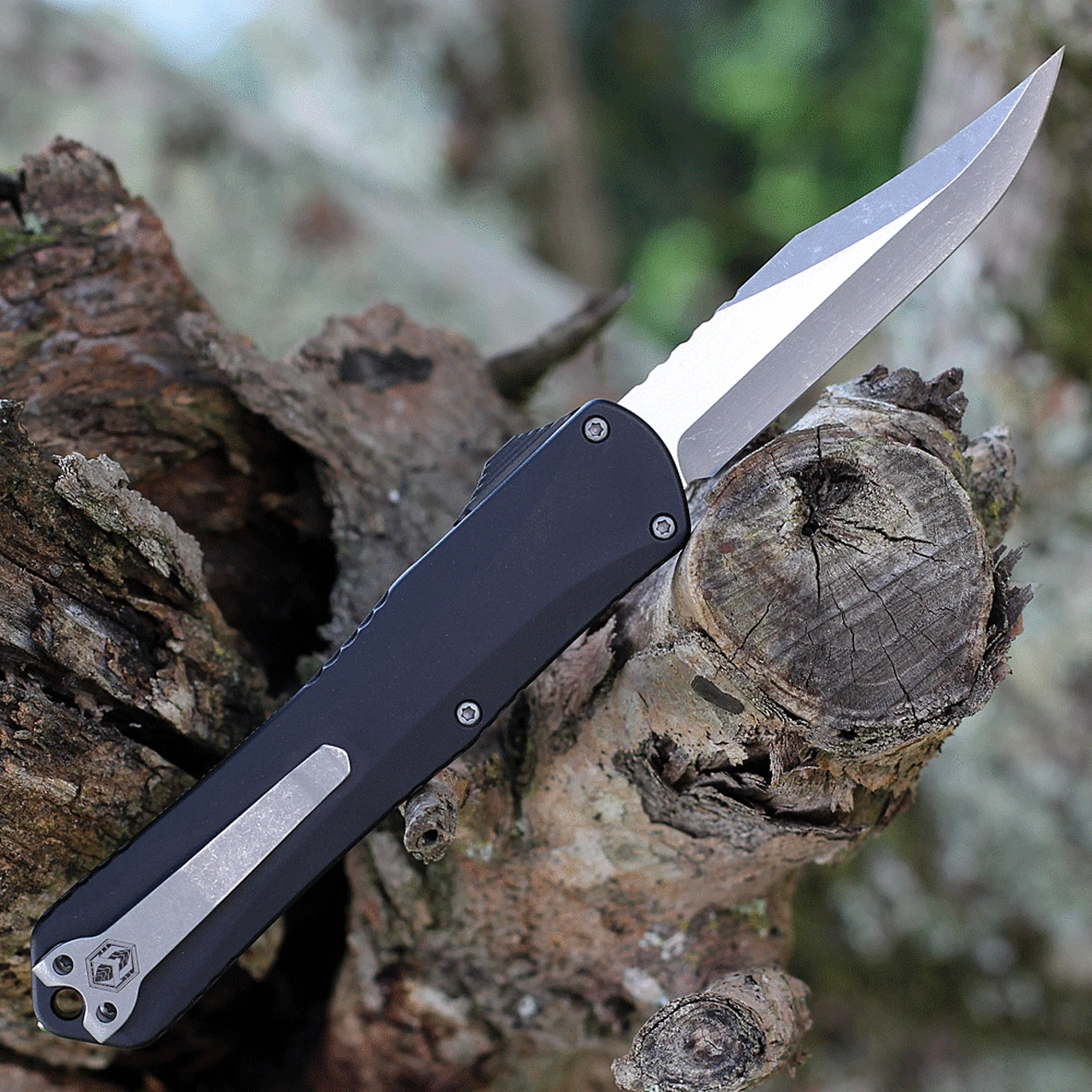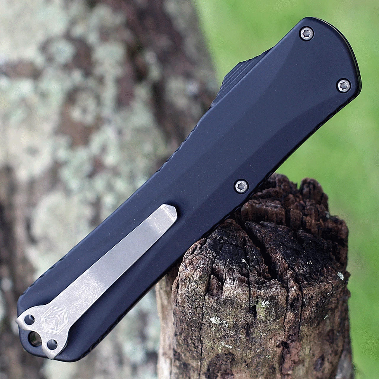 Heretic Knives Manticore X OTF Automatic (HO30B-5A) – 3.70″ Bowie Battleworn Black Persian Blade, Black Aluminum Handles