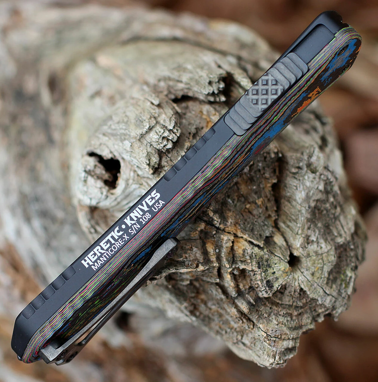 The Manticore X is a double action out-the-front (OTF) automatic knife, the blade can be deploued and retracted with one hand. The knife’s smooth action starts with a stepped thumb slide so you are able to fire the blade with confidence. Elegant sweeping lines and jimping down the length of the handle add depth to an otherwise smooth body. A hardened steel glass breaker rounds out the handle.