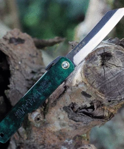 This Higonokami Jade is made with aogami paper steel blade and a green glitter stainless steel handle. This knife features a 3.00″ satin reverse tanto blade. As is common for this type of knife, it doesn’t have a lock and the blade completely disappears inside the handle when closed.