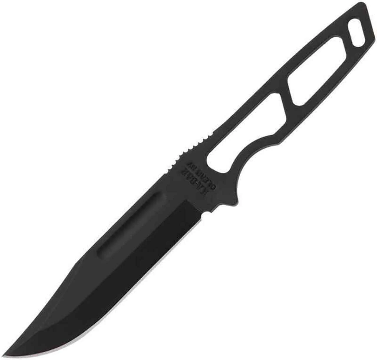 KA-BAR Short USA Neck Knife, 1095 Carbon Steel, Skeletonized Handle Short USA Neck Knife – 7 7/8″ overall. 4″ blade. One-piece black finish 1095 carbon steel construction. Skeletonized handle. Black thermoplastic sheath.