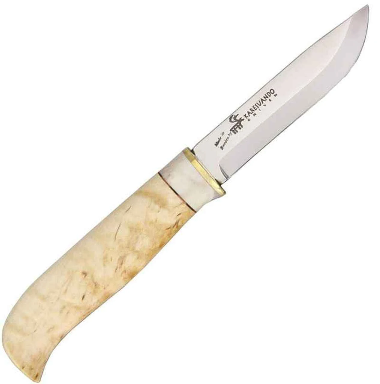 - Handle of oiled curly birch and reindeer antler.