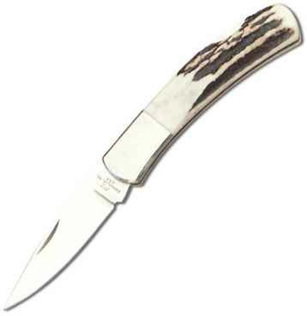 Katz Gentleman’s Lockback Stag. 3 3/8″ closed. 2 3/8″ ATS-34 stainless high polish blade. Genuine stag handles with nickel silver bolster. Blue composition gift box with red form insert.