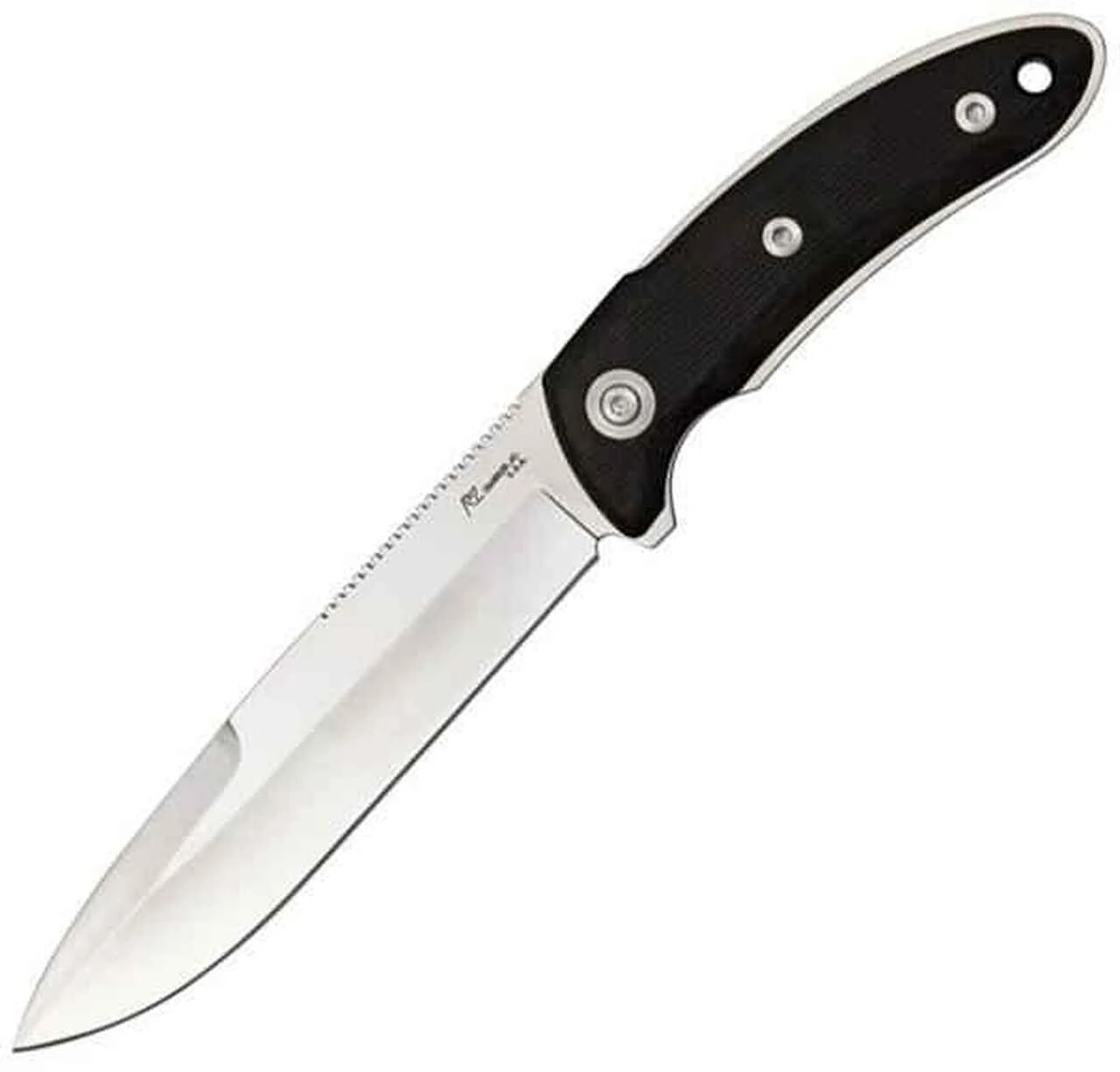 Katz Predator II. 10 1/4″ overall. 5 5/8″ XT-80 stainless blade. Full tang. Black Kraton diamond checkered handles. Lanyard hole. Brown leather belt sheath.