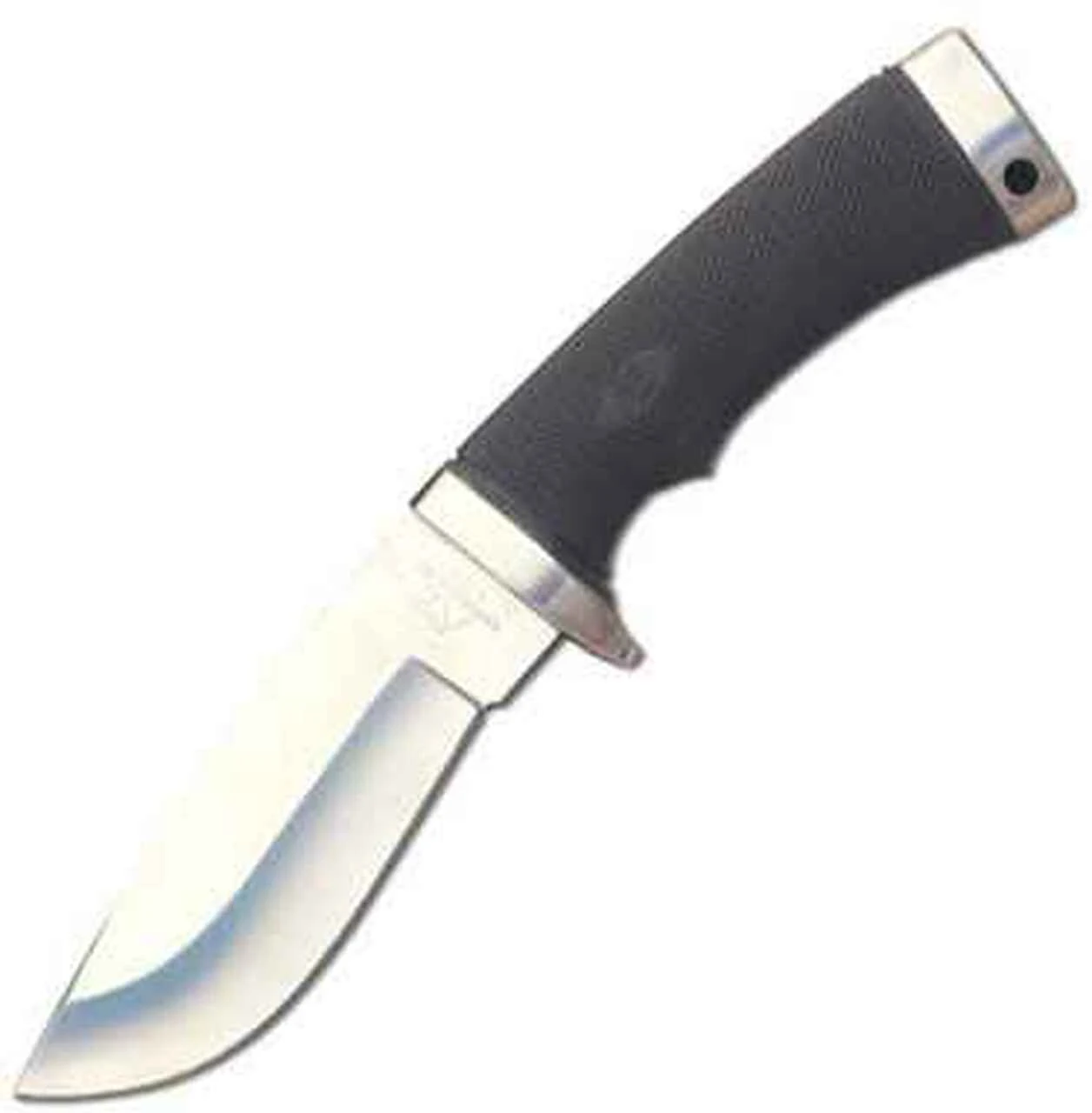 Katz Wild Cat Series Fixed Blade. 9 1/4″ overall. 4 5/8″ XT-80 stainless satin finish blade. Full tang. Black Kraton diamond checkered handles with stainless guard and flared butt. Lanyard hole. Brown leather belt sheath.
