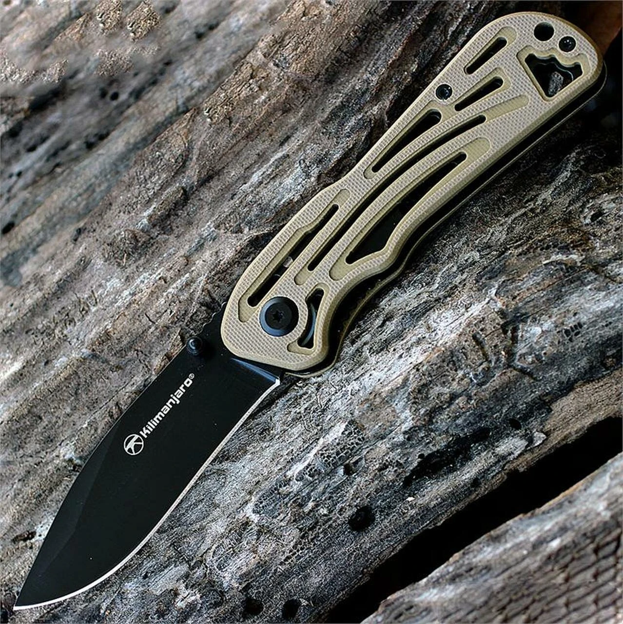 Kilimanjaro, 910022, Caula folder, 3.4 in. Drop Point Black Satin Blade, Tan Handle