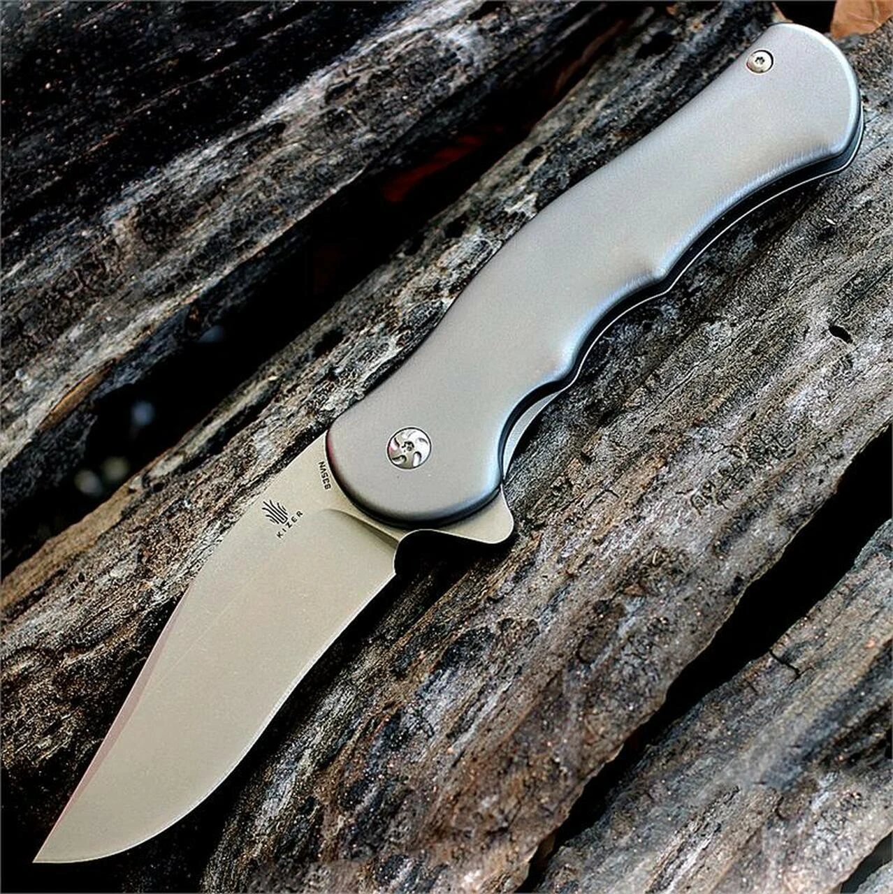 Kizer Cutlery, 455A1, Dorado, 3.48 in. S35VN Clip Point Stonewashed Blade, Titanium Handle, Framelock