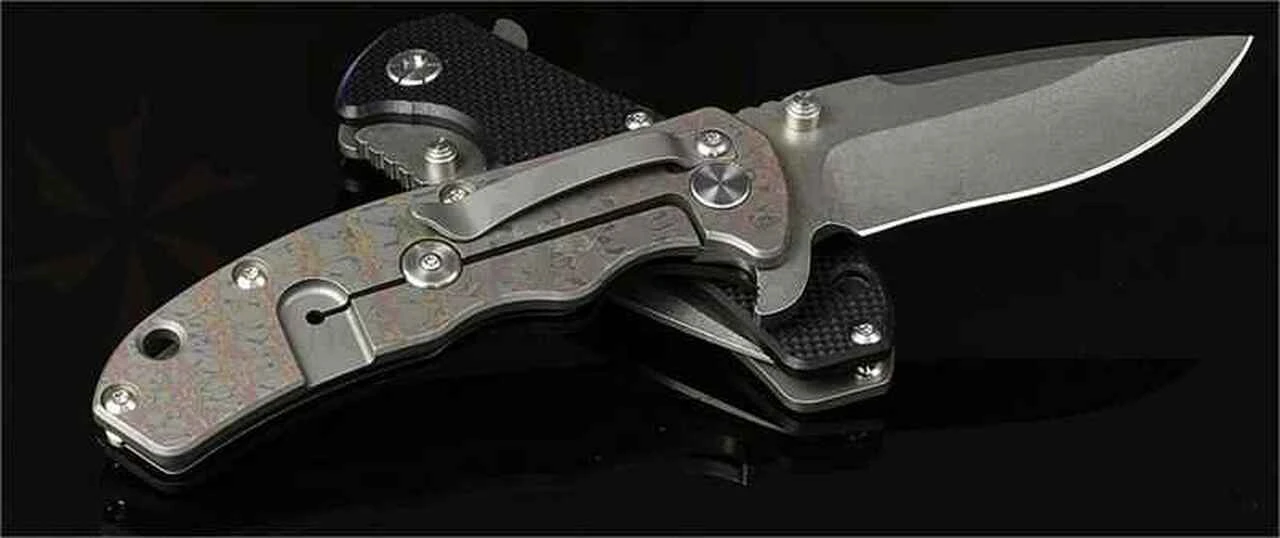 Kizer Cutlery Titanium Framelock. 4-3/4″ closed. 3-1/2″ CPM-S35VN stainless blade with dual thumb studs and flipper. Black G-10 front handle. 6AL4V titanium back handle with anodized pattern. 6AL4V titanium pocket clip. Weight: 5 oz. Made in China.