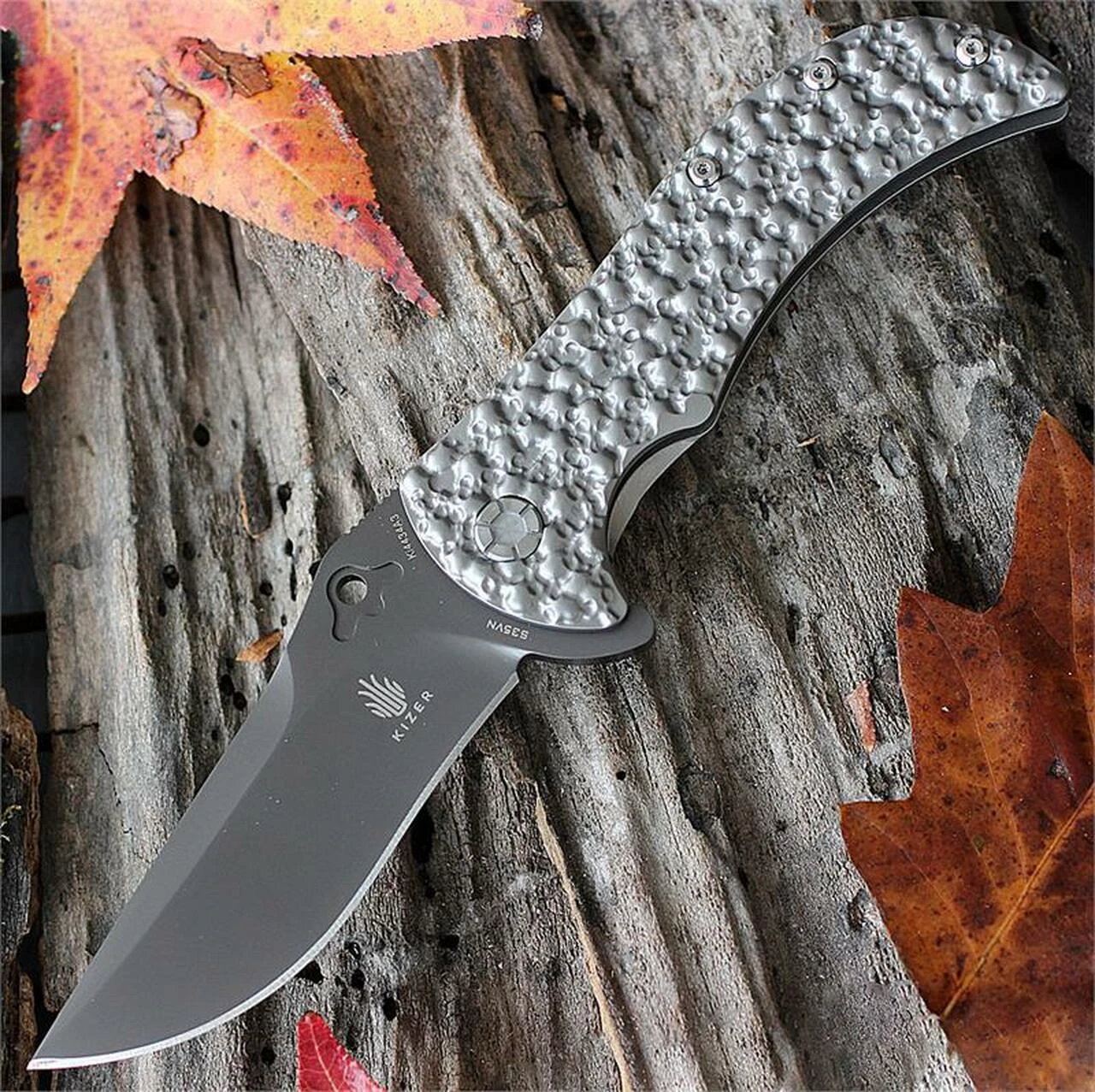 Kizer Cutlery Ki4434 Zambi Flipper 3.625 in. S35VN Flat Gray Blade, Textured Titanium Handles Frame Lock Folder