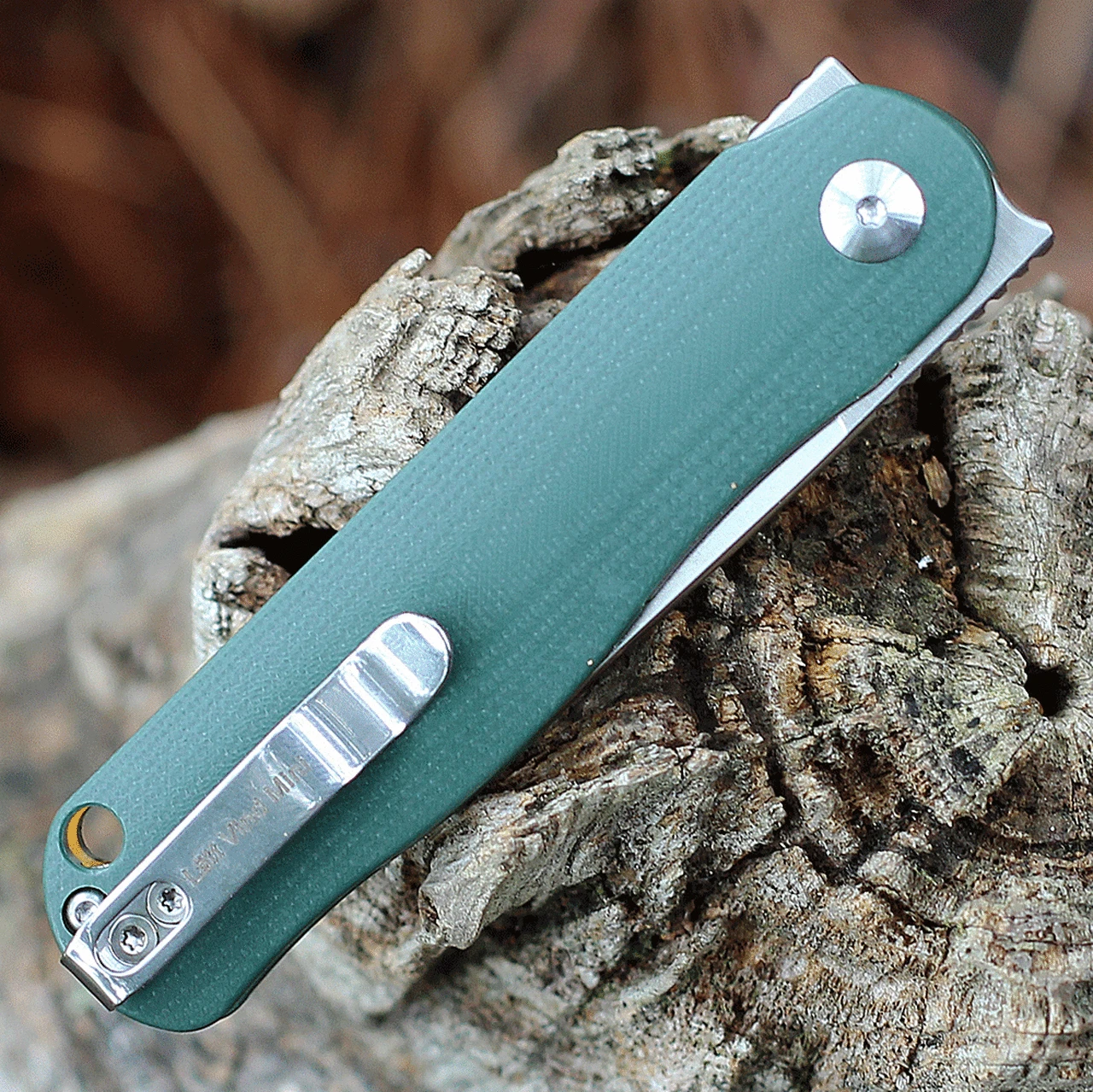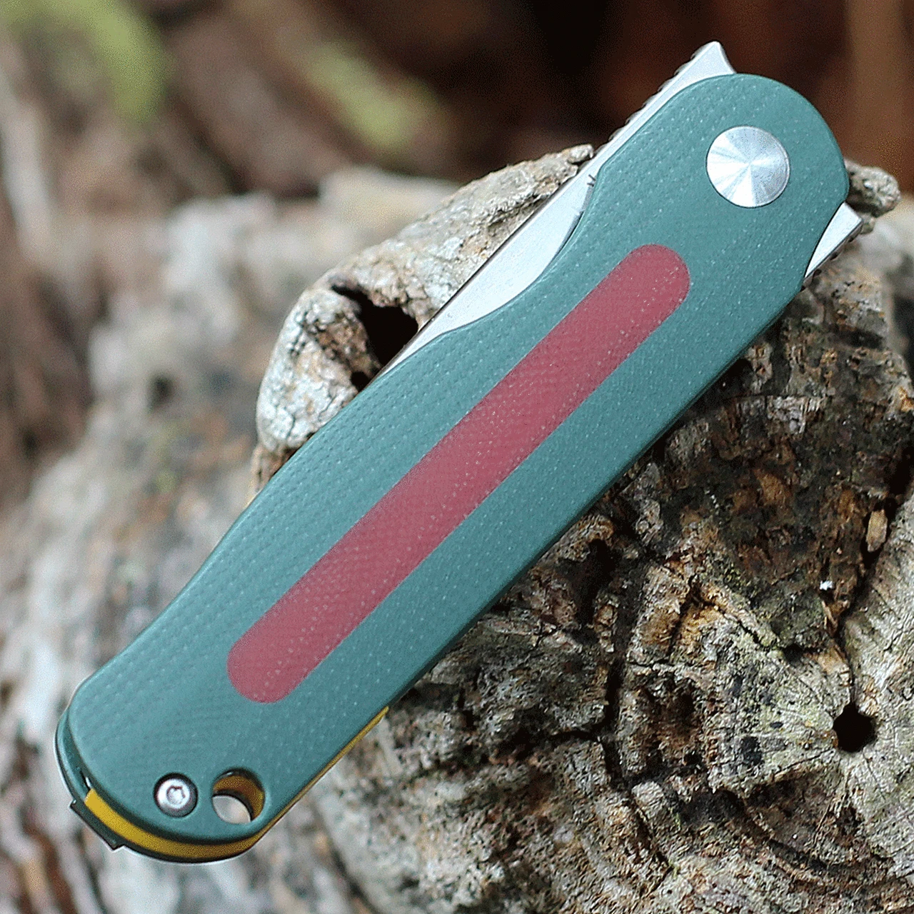 Lätt Vind is Swedish, meaning “light breeze”. Kizer made this knife to be a lightweight, gentleman’s knife. The aesthetic of the front and back flippers fit perfectly with the lines and construction of the knife. The overall appearance looks clean and cut. This dual flipper knife is equipped with a smooth ball bearing system to achieve quick opening and closing action. The flat ground blade is a spear point shape in a satin finish.