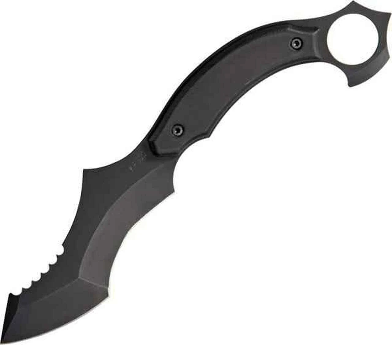 Krudo Knives Mini MMF8. 3/4″ overall. 4 1/8″ blade with recurved bottom edge and curved top edge with partial serration. One piece black oxide coated 1095 high carbon steel construction. Black stainless handles. Oversized ring pommel with striker. Black molded Kydex sheath with MOLLE clip.