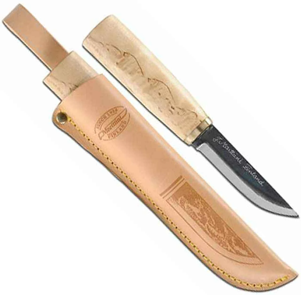 The blade is made of traditional cerbon steel that is perfect for carving wood and easy to sharpen to its original sharpness when needed. The handle is made of Finnish curly birch and the knife is protected with a beautiful naturla colored leather sheath. This knife is suitable for the daily gear of both campers and craftsmen as well as for fishermen and hunters.