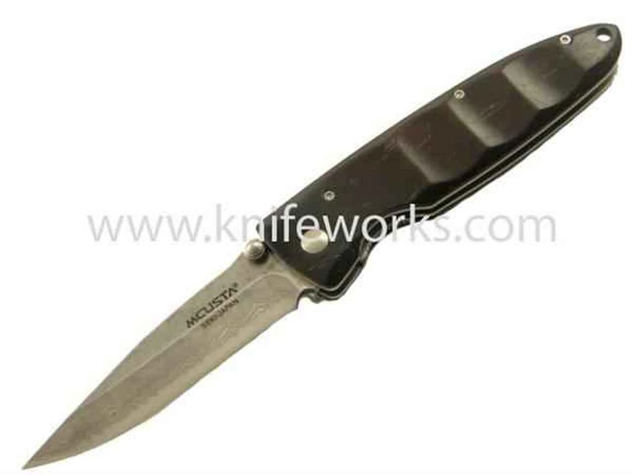 Mcusta Damascus Basic Folder African Ebony Wood. 4 1/4″ closed linerlock. 33 layer nickel damascus steel blade with a VG-10 core (RC 59-60) and thumb studs. Contoured African Ebony Wood finger groove handles. Pocket clip. Specially designed Teflon washer system for silky smooth action. Hand finished.