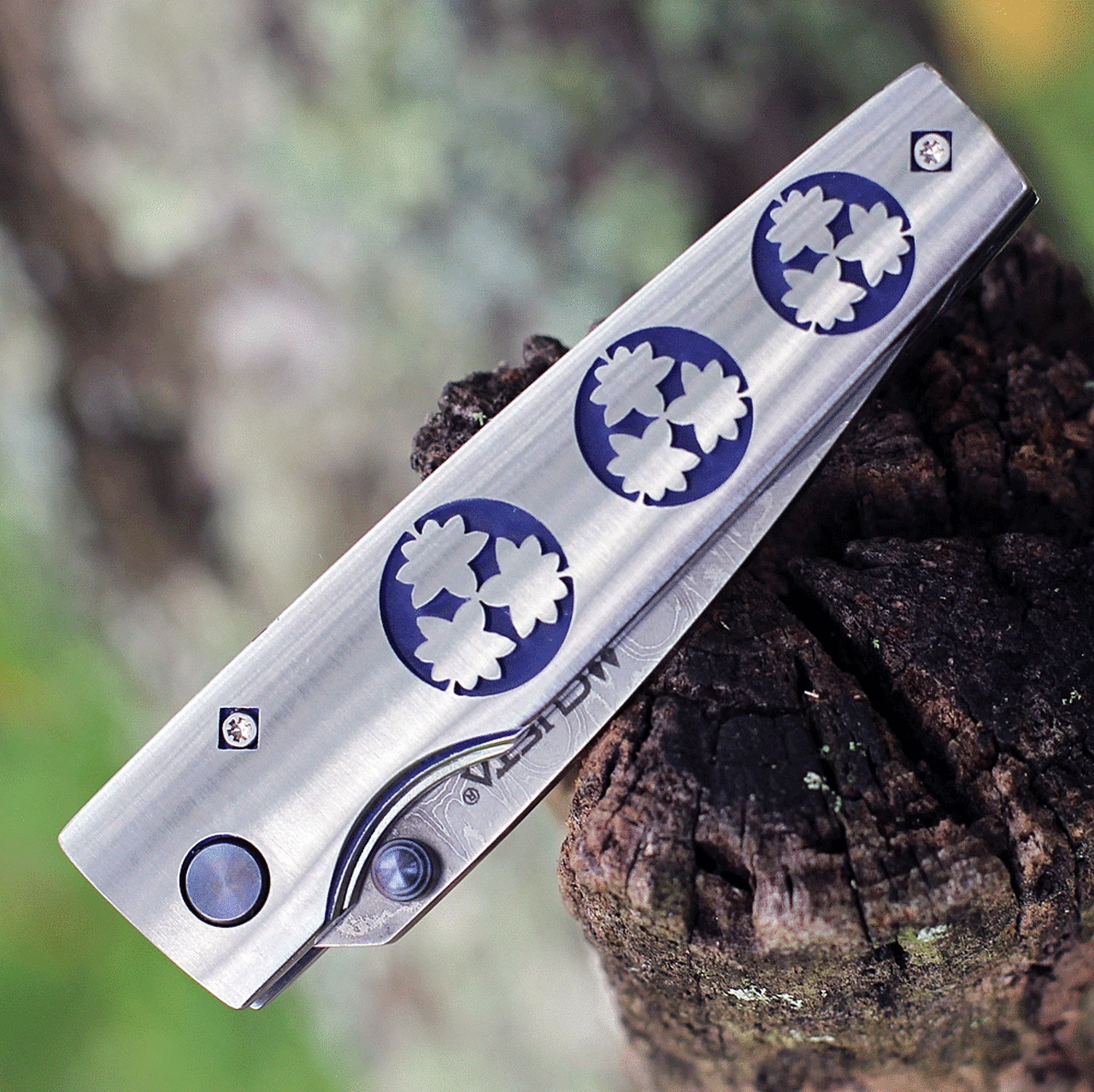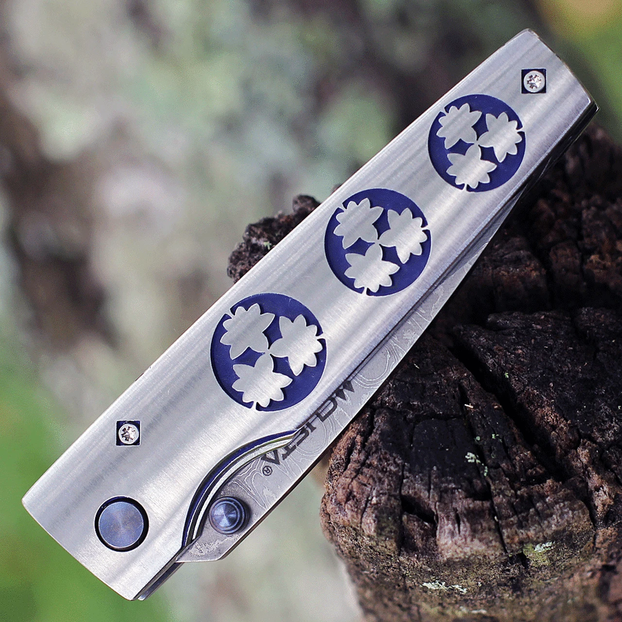 3 1/2″ closed linerlock.33 layer nickel damascus steel with s VG-10 core blade with ambidextrous thumb studs.Handles are stainless steel with laser engraved Kamon crests,anodized pivot pin and checker engraved back.Each knife has a specially designed Teflon washer system for silky smooth action.All the knives comes with a decorative woven nishijin pouch.