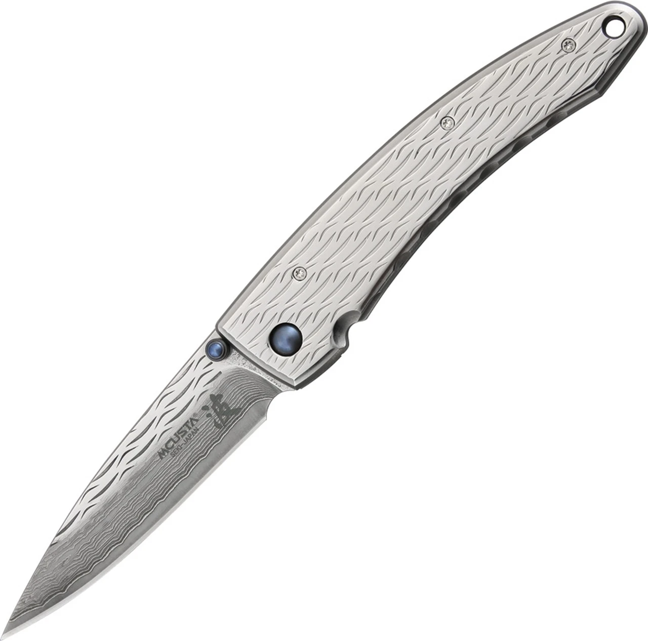 4 1/4″ closed framelock. 3 1/4″ VG-10 Damascus steel blade with dual thumb studs. Stainless handles with decorative styling. Lanyard hole. Stainless pocket clip.
