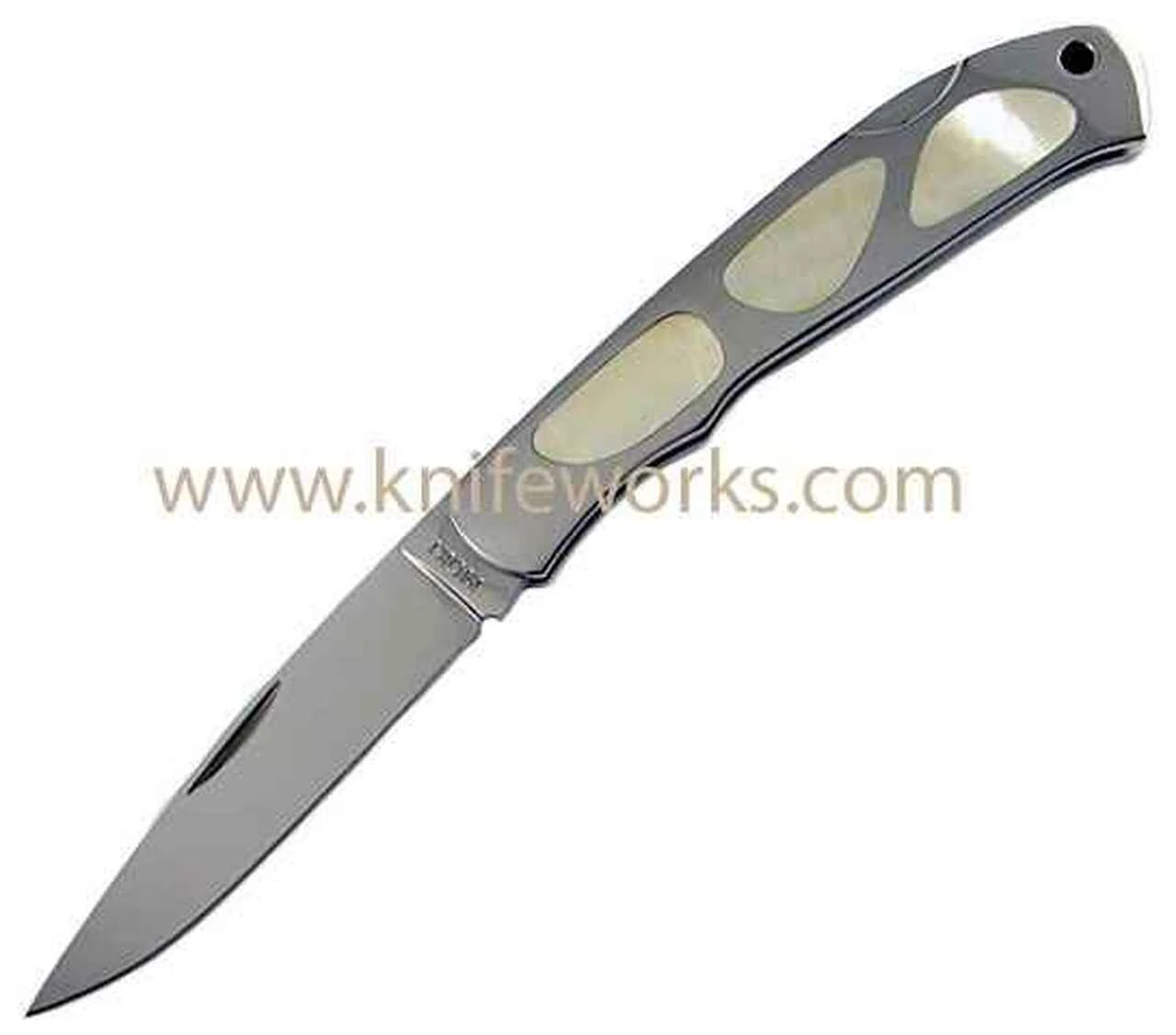 Moki Blossom. 3 5/8″ closed lockback. Mirror polished ATS-34 stainless blade. SUS-410 stainless handles with gold pearl inlays. Lanyard hole. Green Canvas slip pouch.