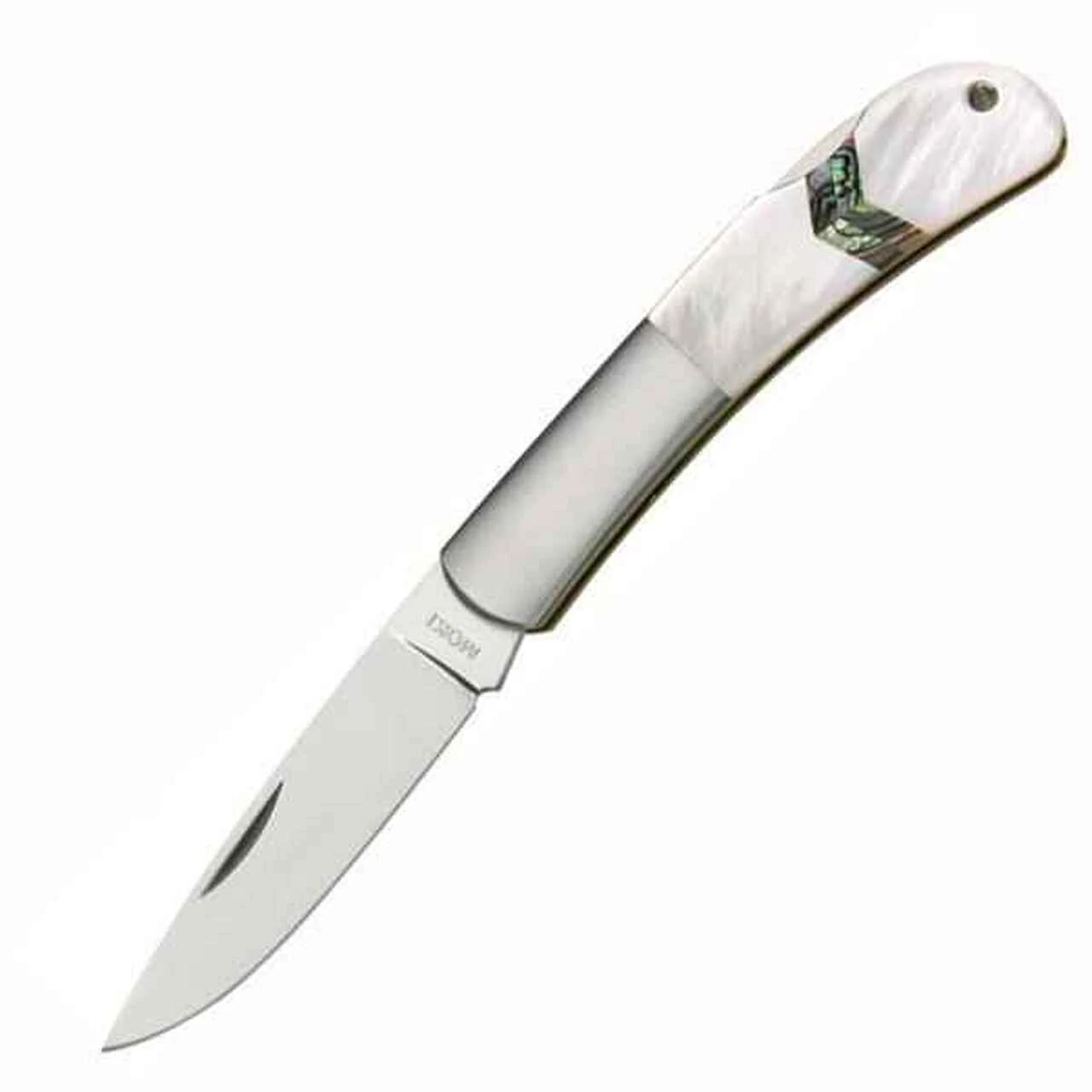 Moki Glory. 3 3/8″ closed lockback. AUS-8 stainless mirror polished blade. Mother of pearl handles with arrow shaped abalone inlay. Brushed stainless bolster. Lanyard hole. Nylon pouch.