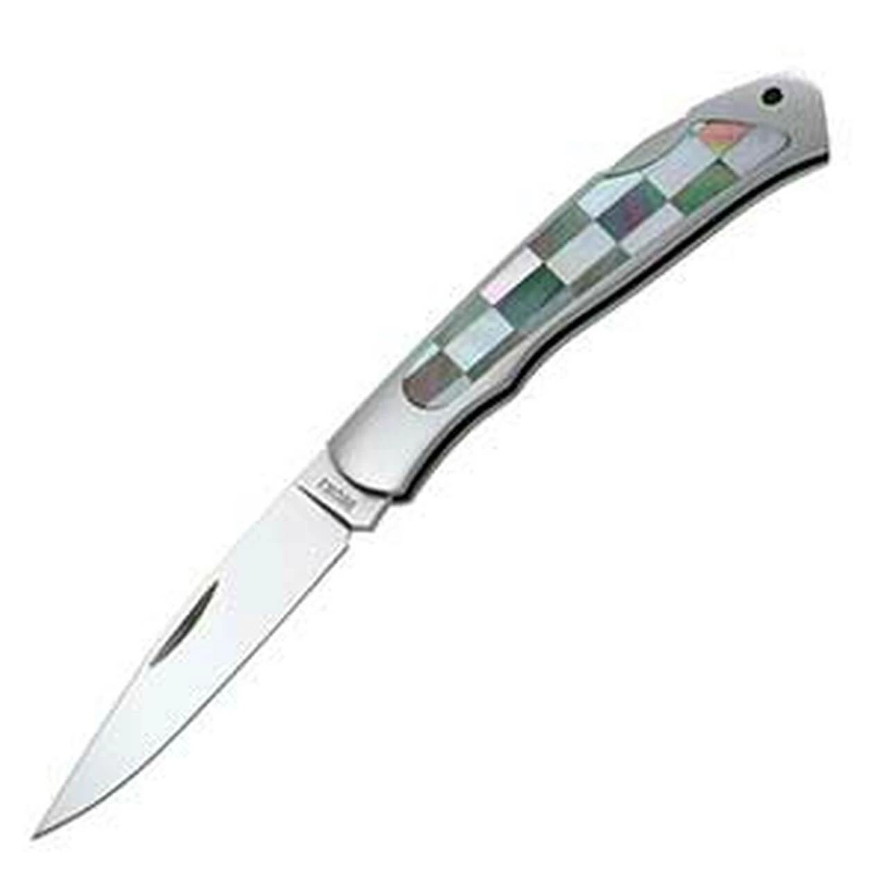 Moki Lockback, Polished stainless handles with White and Black mother of pearl inlays.