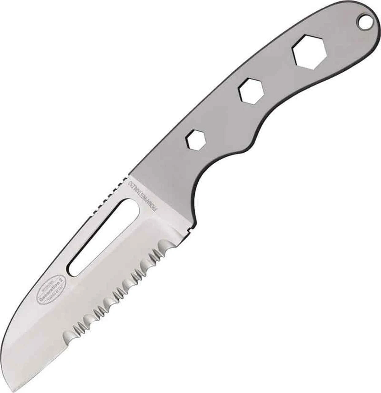 Myerchin Generation 2 Safety Dive Knife – 8 1/2″ overall. 4 1/8″ partially serrated sheepsfoot blade with shackle slot. One piece German Pro Marine stainless construction. Fingergrooved handle features three of the most commonly used metric wrenches. For survival, the handle can be wrapped with 1/8″ parachute cord. Lanyard hole. Black nylon belt sheath. Serial numbered.