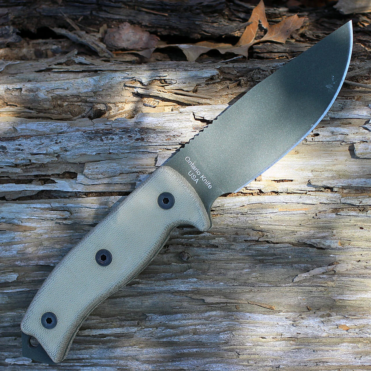 Ontario 8691 Rat-5 OD Green, 5″ 1095 Plain Blade, Tan Micarta Handle