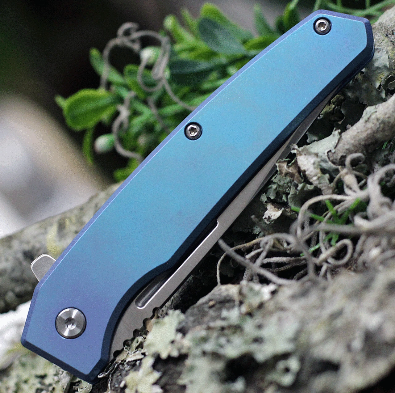 Ti-22 is Titanium, and Titanium means strength. With a handle and frame lock completely constructed of a high-grade material like Titanium, you can trust that the Ultrablue will be as dependable as it is colorful. With an iridescent oxidation, the handle’s color shifts from a deeper blue to a purple similar to an Ultraviolet hence the name Ultrablue.