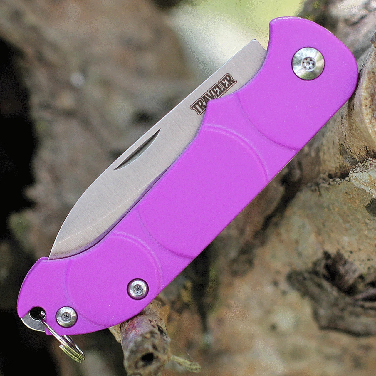 The Ontario Traveler is a small folding knife designed to go on your keychain. It’s made of satin-finished stainless steel, and a purple plastic handle. Add this knife to your keys today, and you’ll never be without a knife