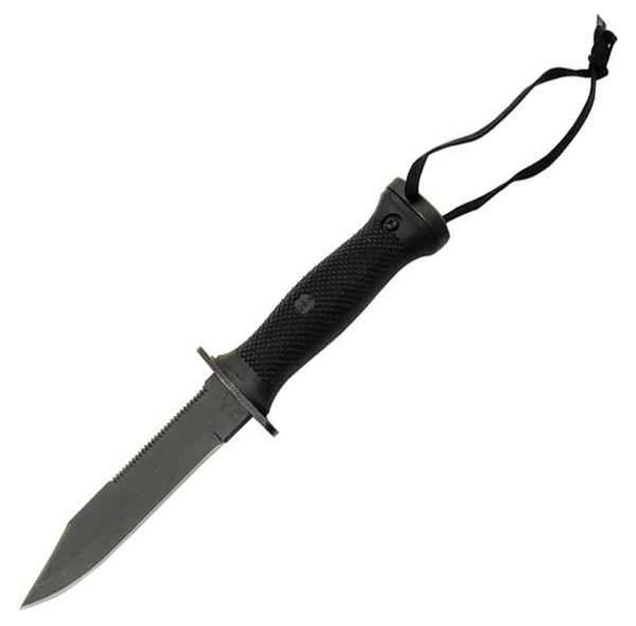 Ontario Mark 3 Navy Combat. 10 7/8″ overall. 6 1/2″ black oxide finish stainless sawback blade. Molded black checkered high-impact plastic handle. Cordura and plastic sheath.