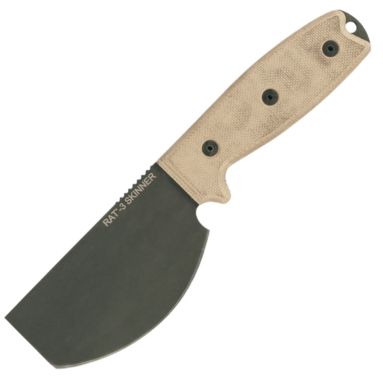 Ontario Rat-3 Skinner (8661) – 3.75″ High Carbon Steel Black Blunt Blade, Tan Micarta Handle w/ Leather Sheath