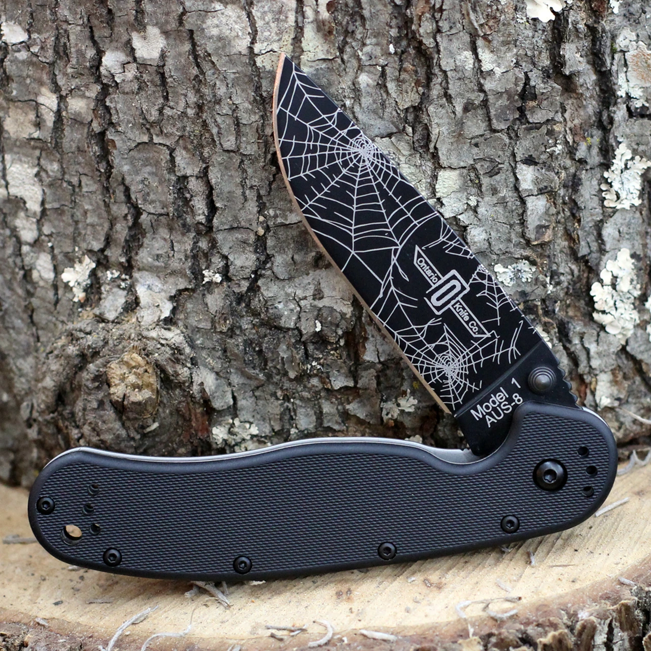 Ontario Rat Folder, Black Blade w/ Spider Web Design, Black Handle, PlainEdge