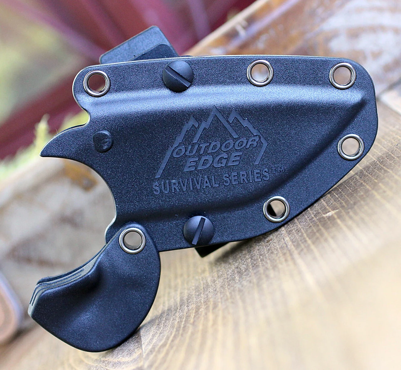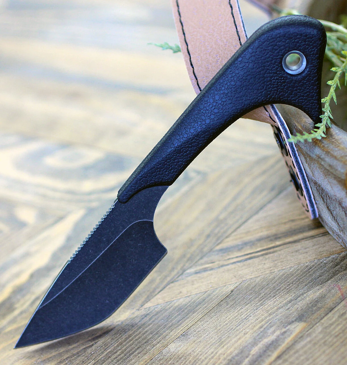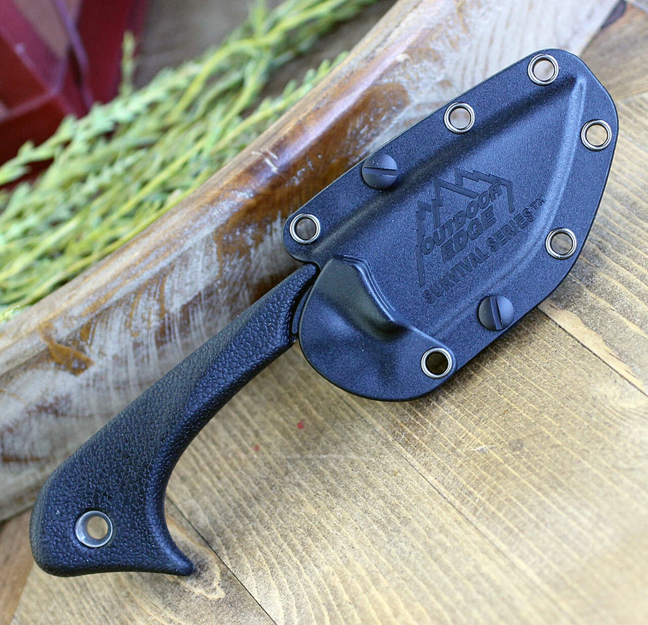This multi-purpose utility knife is perfect for all outdoor uses and as a lightweight backup blade for any survival situation. The 2.5” Blackstone™ coated 8Cr14MoV stainless blade is precisely heat treated and hand finished shaving-sharp for superior edge retention and performance. The distinct duck head handle with TPR coating is extremely comfortable for a secure lock-on grip, even when wet. Features a multi-carry sheath system with a 360 degree rotating clip that attaches to any flotation, fishing, or diving vest, and is compatible with any MOLLE system. The clip is removable and replaceable via two Chicago-style fasteners, and the included 550 Paracord lanyard quickly converts the Le Duck to a neck knife. Designed by custom knife maker Jerry Hossom.