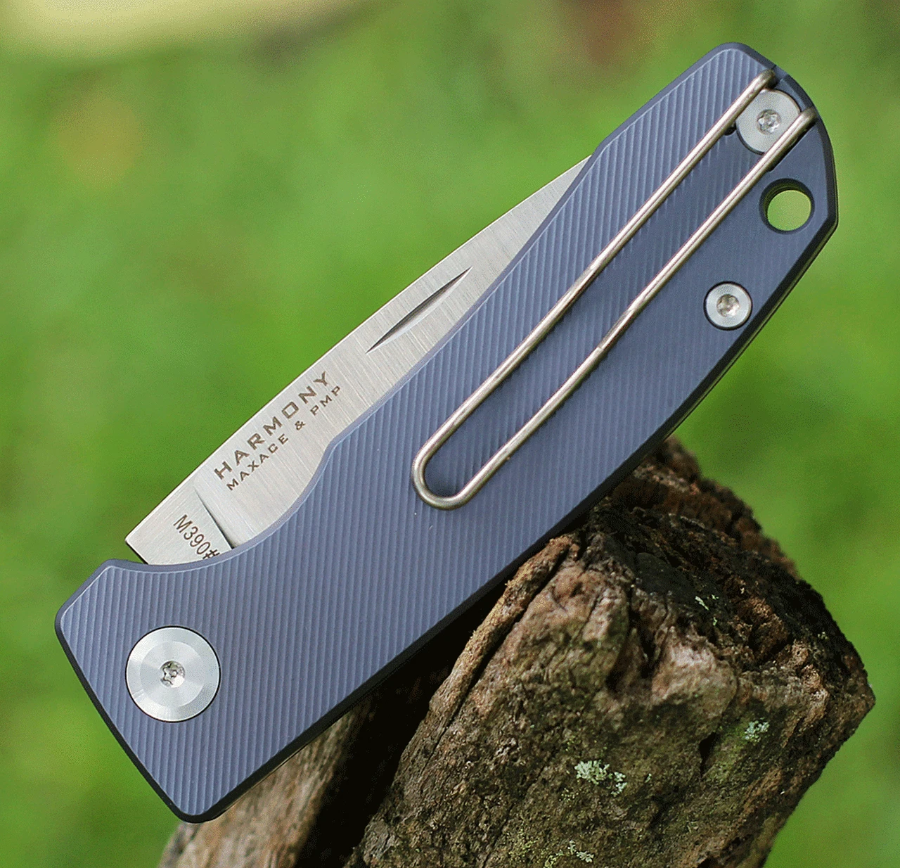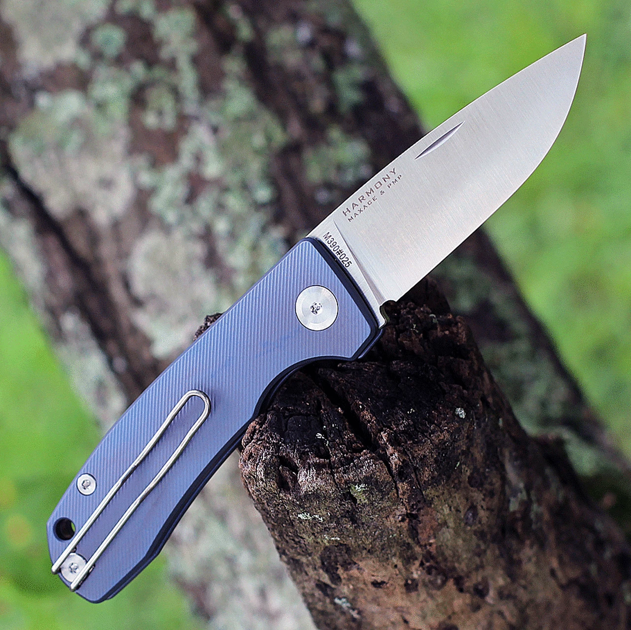 PMP Knives & Maxace Harmony PMP005, 3″ Satin Bohler M390 Drop Point Blade, Blue Titanium Handles