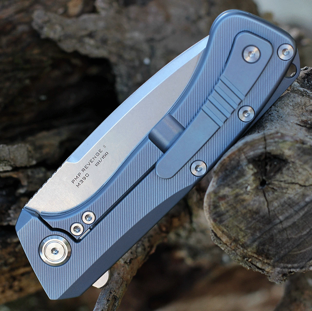 PMP Knives Revenge II Frame Lock Knife – 3.74″ M390 Satin Drop Point Plain Blade, Textured Blue Titanium Handle