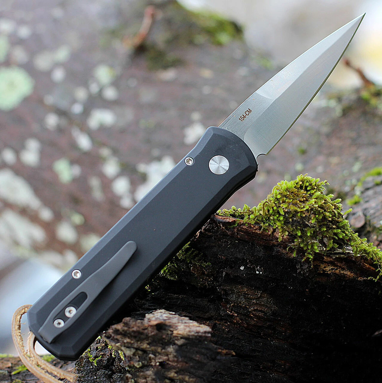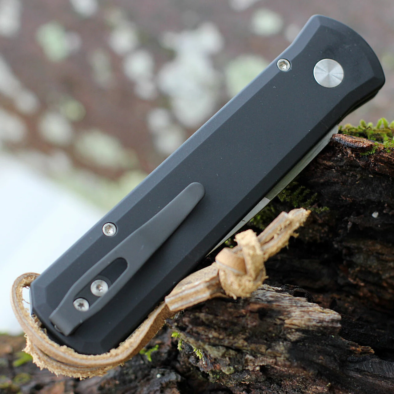 Pro-Tech Godson Automatic “Greg Stevens Design” (7GSD-7) – 3.15″ 154CM Satin Spear Point Blade, Black Aluminum Handle with Brown Leather Inlay and Leather Lanyard