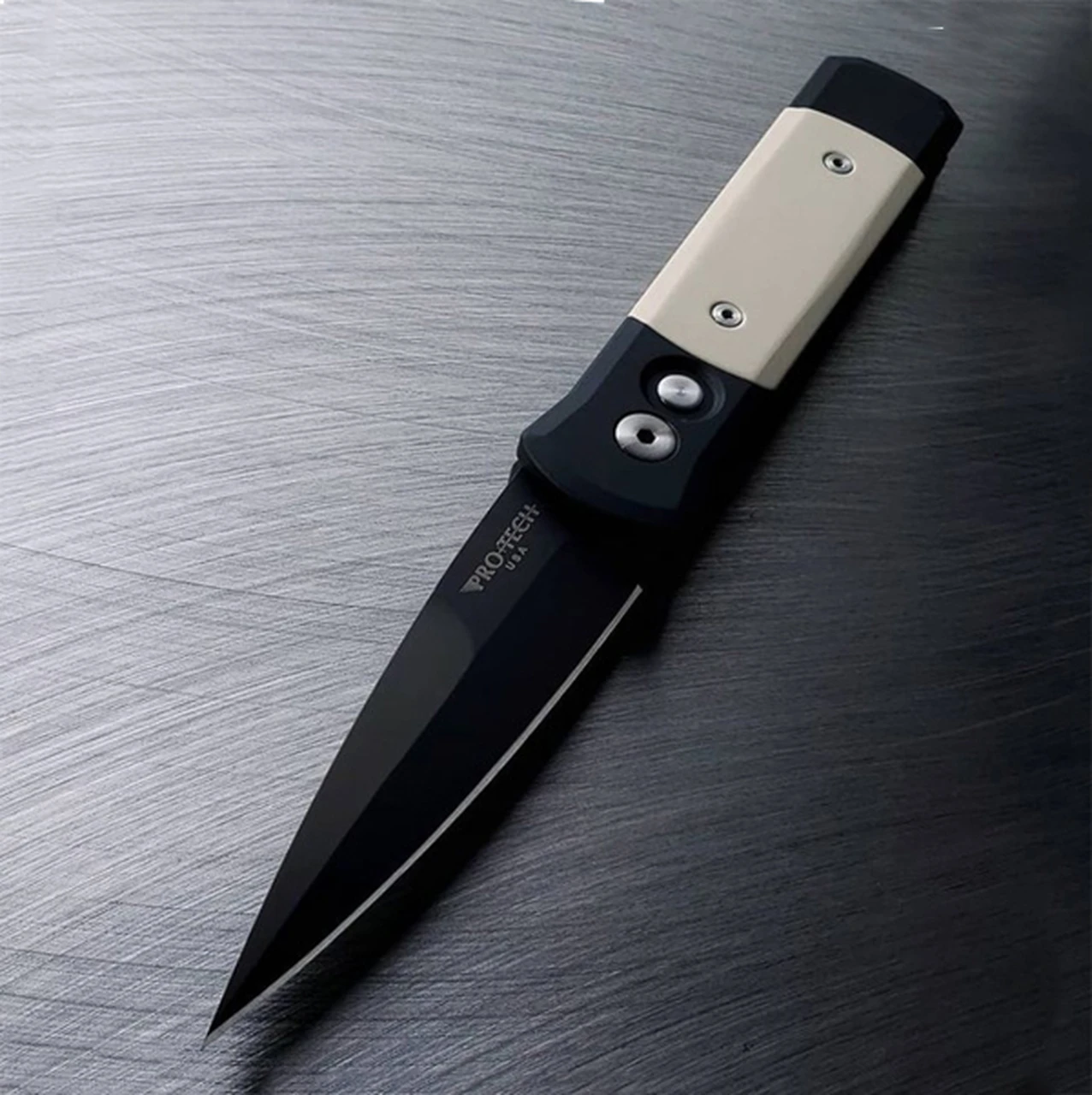 Pro-Tech Knives Godson Tuxedo Automatic (752) – 3.15″ 154CM DLC Black Spear Point Blade, Black Aluminum Handle with Ivory Micarta Inlay
